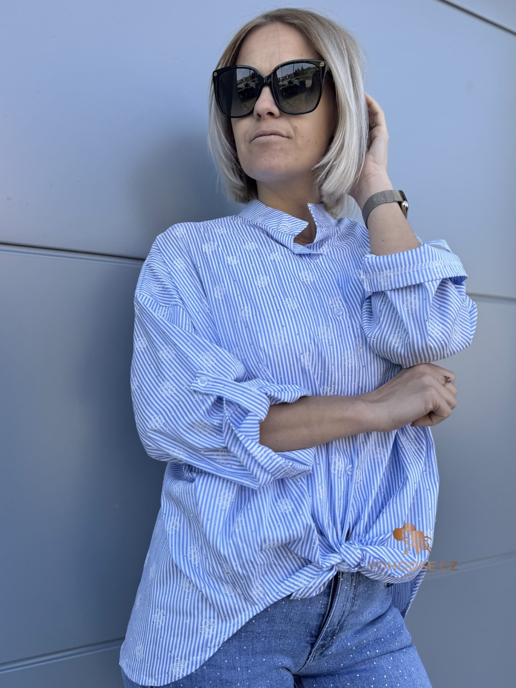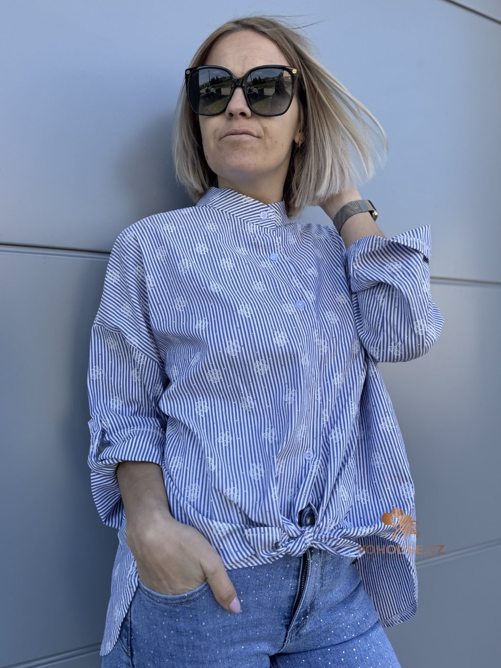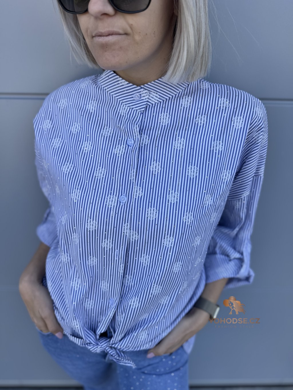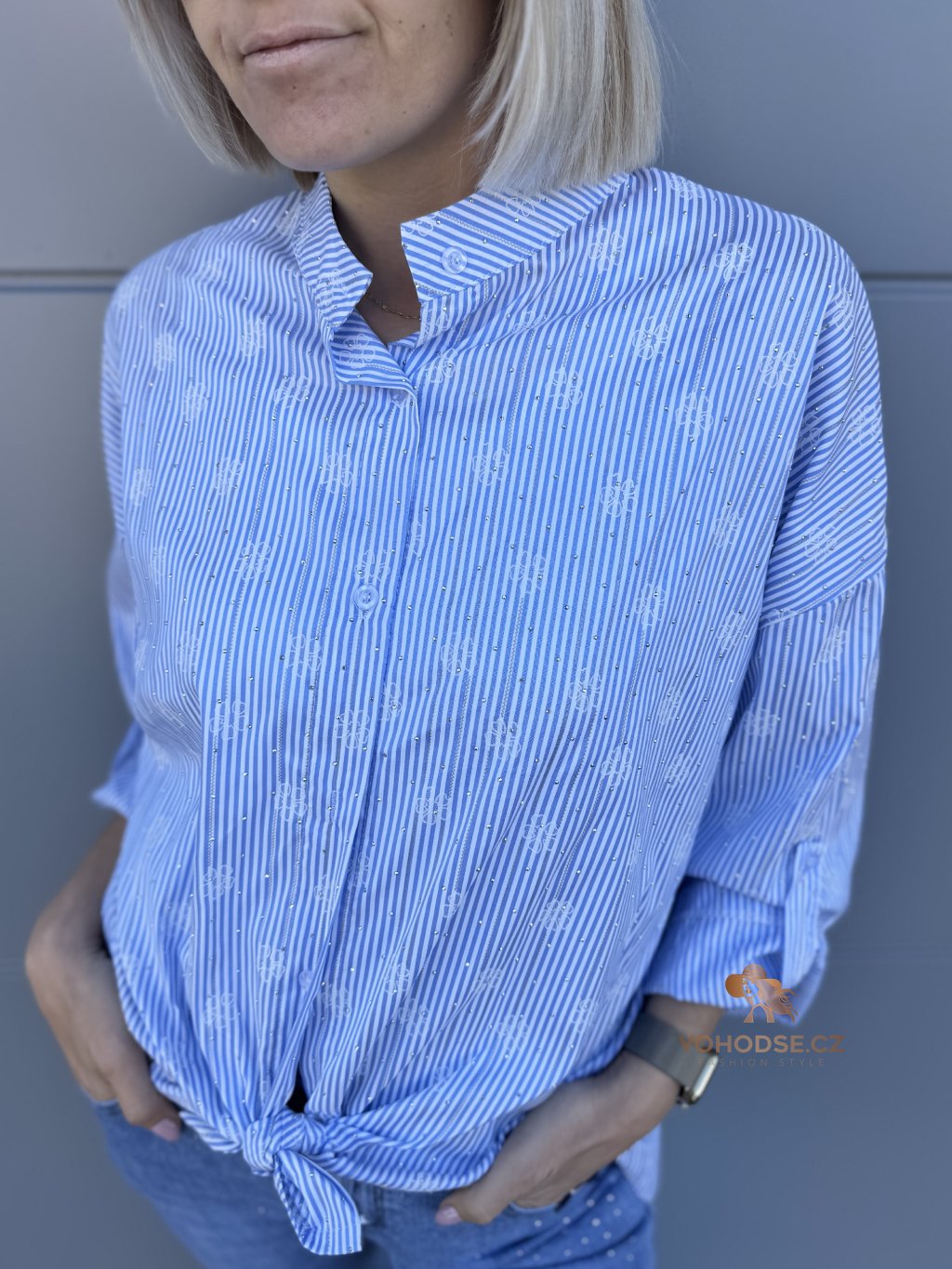 Elegantní košile, která by neměla chybět v žádném šatníku. Jemný pruže doplněný decentním vzorem a jemnými kamínky, působí svěže a stylově, zatímco volnější střih zaručuje maximální pohodlí. Lehký a příjemný materiál je ideální na celodenní nošení. Košili můžete nosit klasicky zapnutou, volně přes kalhoty nebo stylově uvázanou pro ležérní Look.