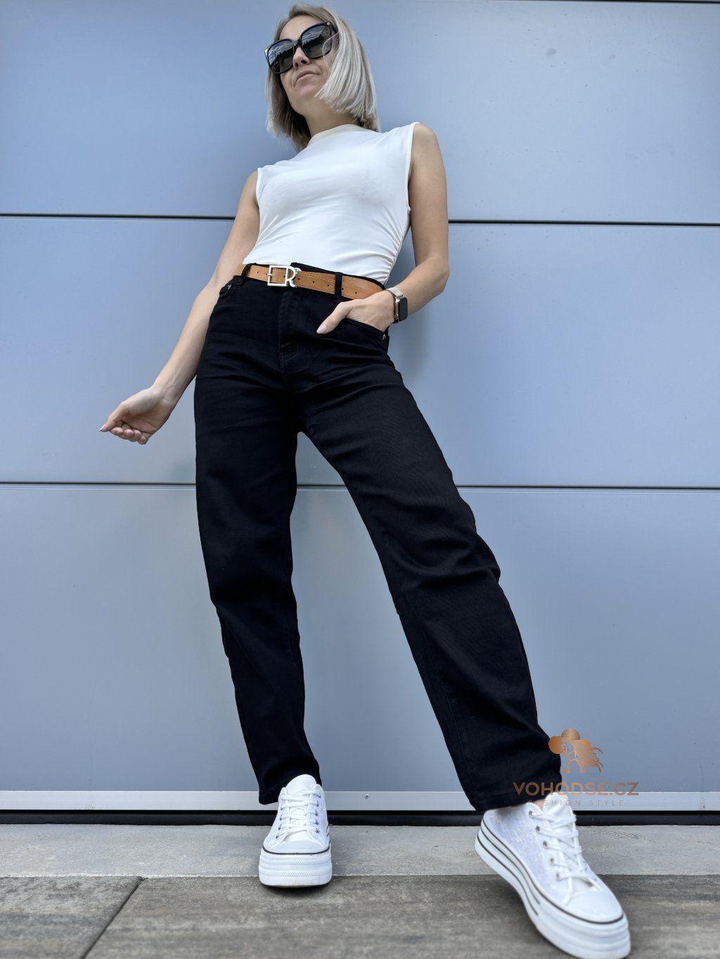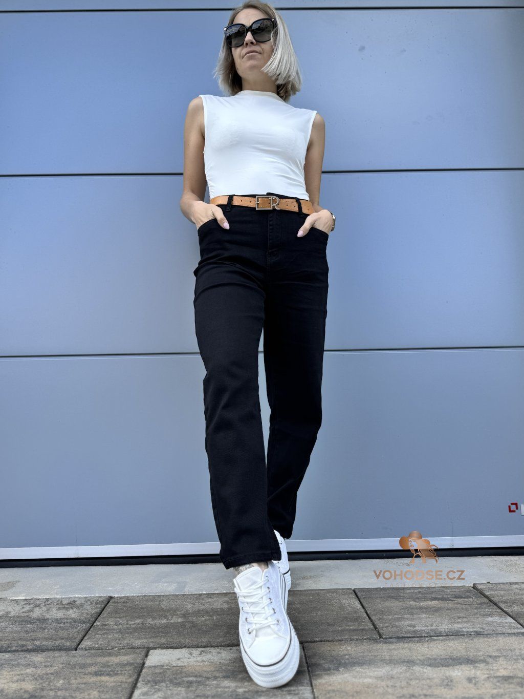 Stylové džíny nově v moderní černé barvě, který si zamiluješ pro jejich pohodlí i univerzální využití. Skvěle sedí na postavě, mají příjemný materiál a jsou ideální jak na běžné nošení, tak i na ležérně elegantní outfit. Díky jednoduchému střihu je snadno zkombinuješ s tričkem, halenkou i svetříkem. Vysoký pas krásně zvýrazní siluetu a zároveň zajistí komfort po celý den.