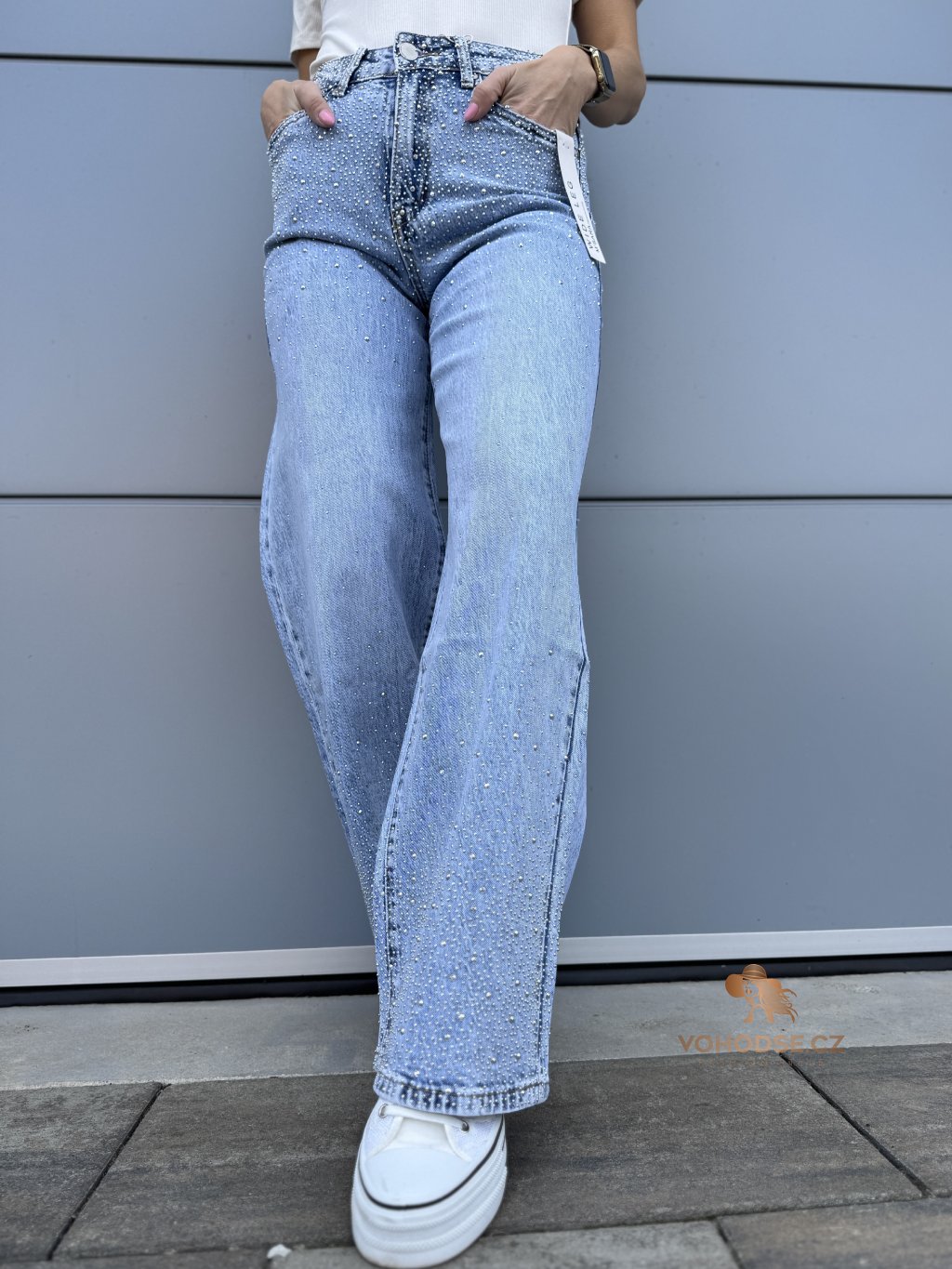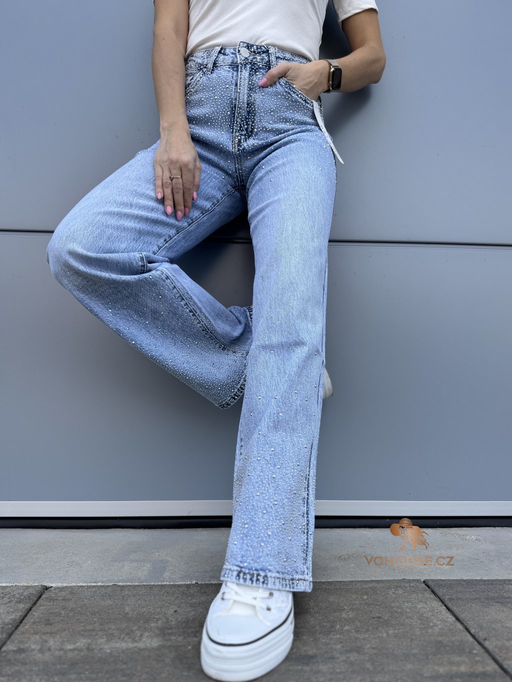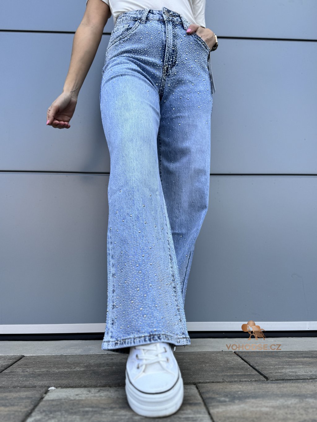 Stylové džíny, které okamžitě zaujmou jemnými třpytivými kamínky v horní i spodní časti. Díky nim působí kalhoty originální a dodají každému outfitu výraznější a moderní vzhled. Džíny mají pohodlný střih, který krásně sedí na postavě a zároveň poskytuje komfort při nošení.