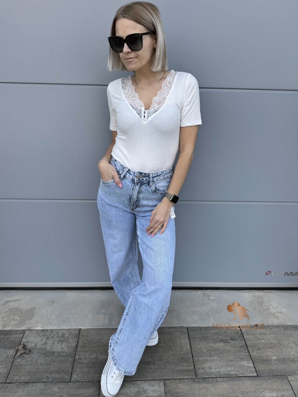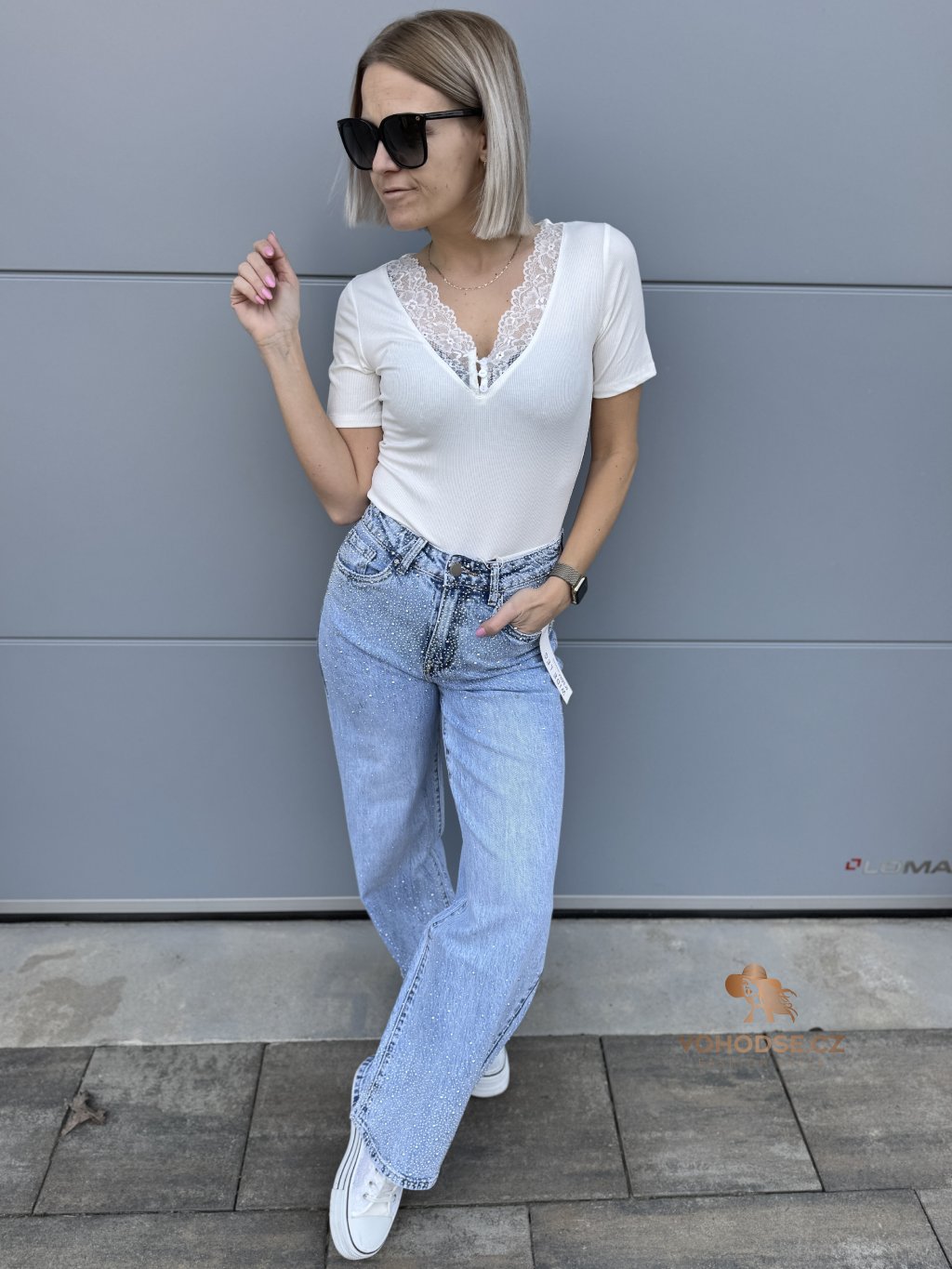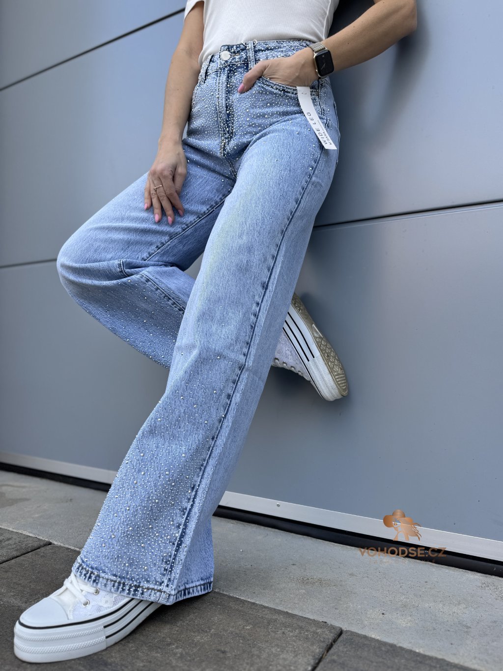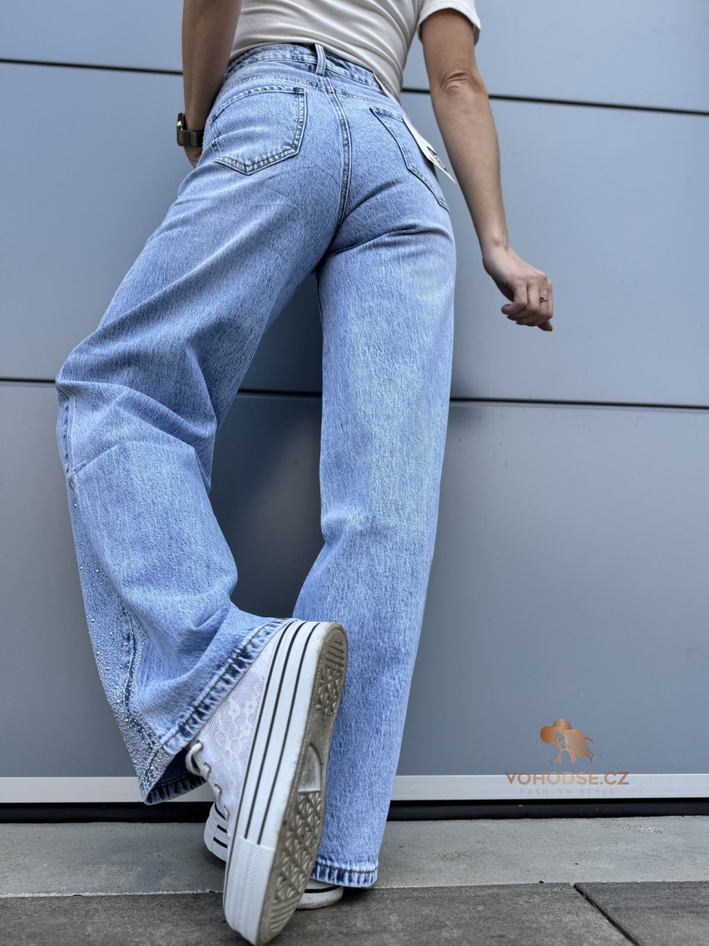 Stylové džíny, které okamžitě zaujmou jemnými třpytivými kamínky v horní i spodní časti. Díky nim působí kalhoty originální a dodají každému outfitu výraznější a moderní vzhled. Džíny mají pohodlný střih, který krásně sedí na postavě a zároveň poskytuje komfort při nošení.