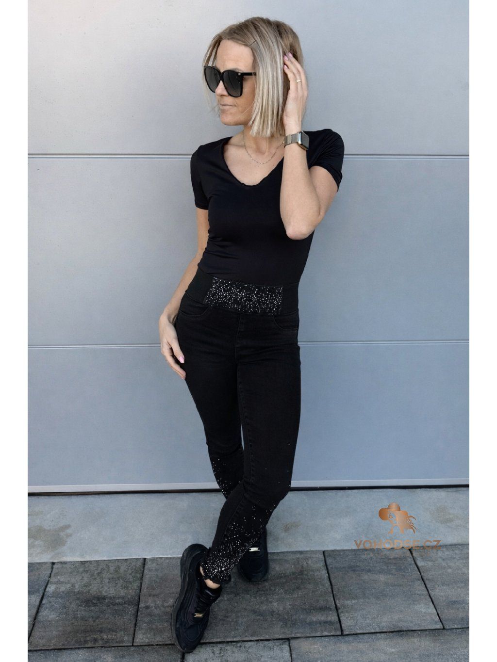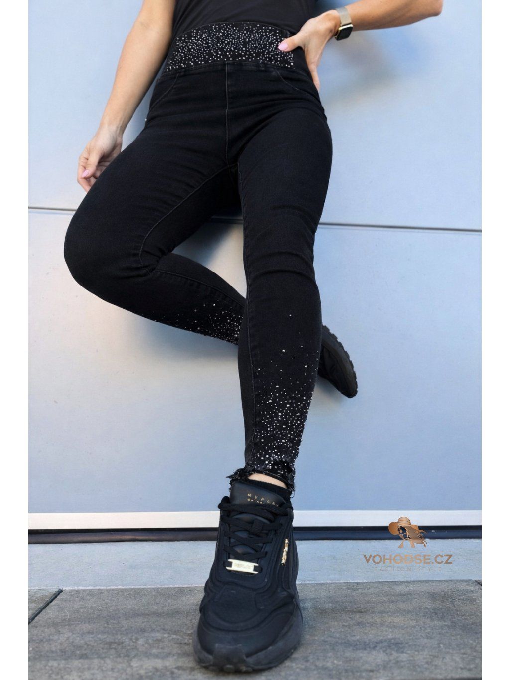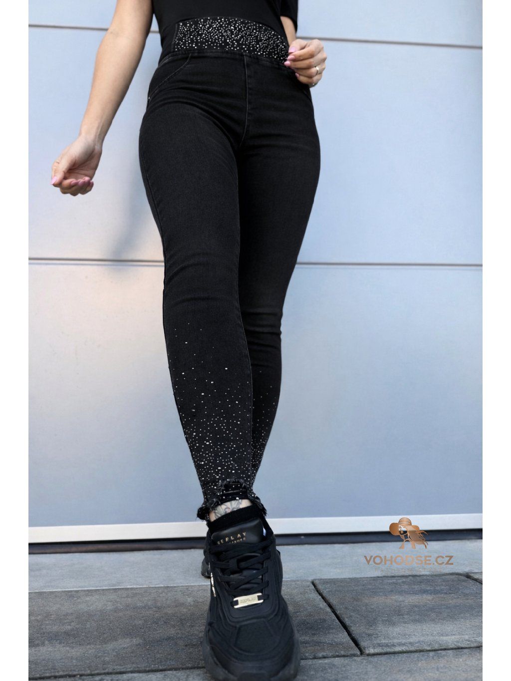 Stylové dámské jegginy, které dokonale zvýrazní postavu. Díky push-up efektu krásné tvarují zadeček a vysoký pas s pružnou gumou v pase zajistí maximální pohodlí po celý den. Jemné kameny v oblasti pasu a na nohavicích dodávají kalhotám šmrnc a dělají z nich nepřehlédnutelný kousek.