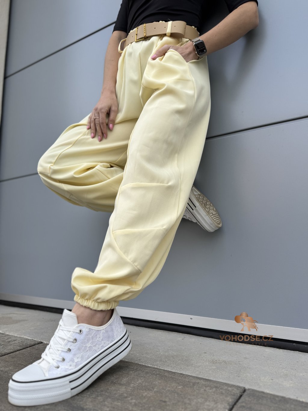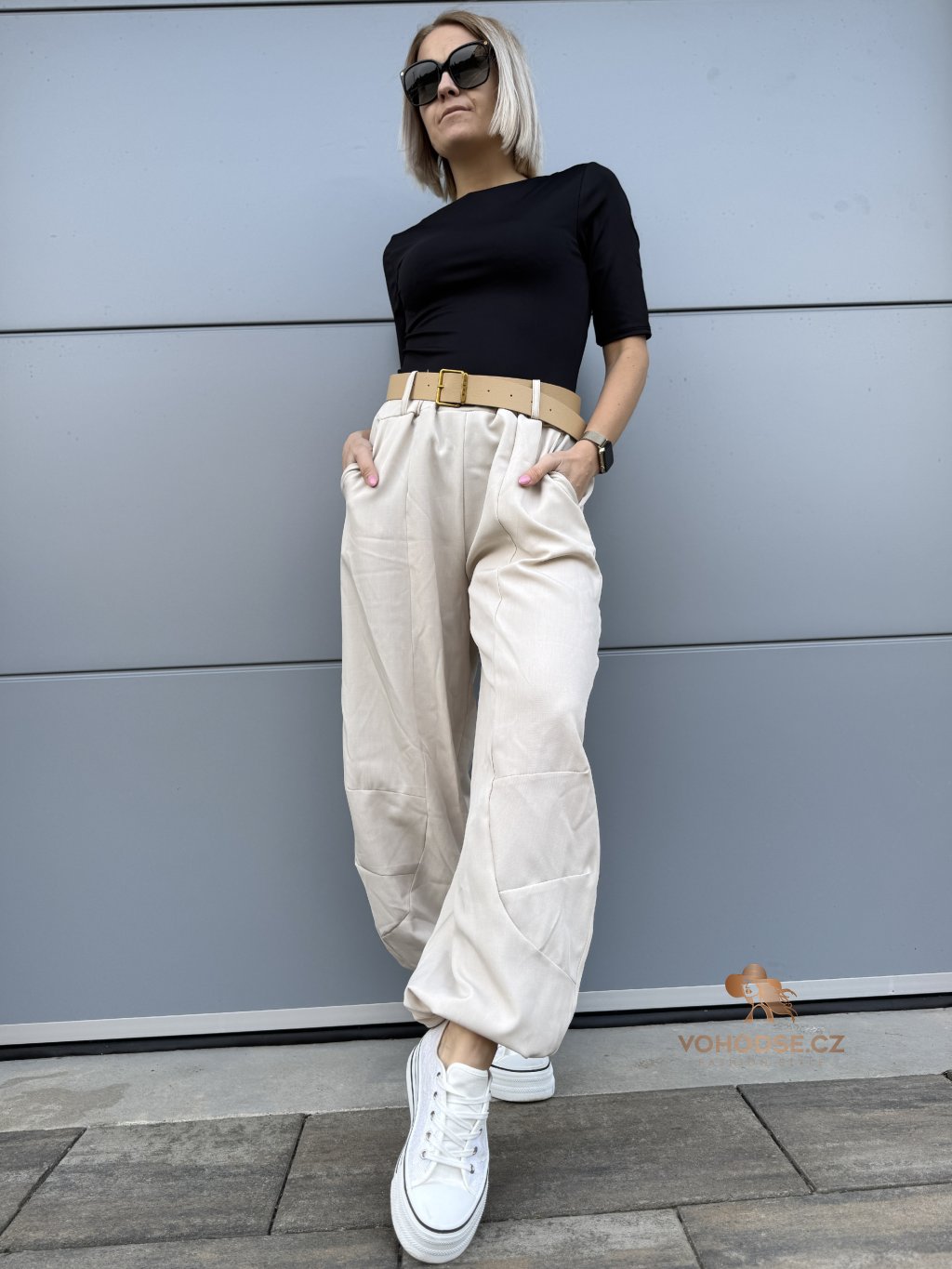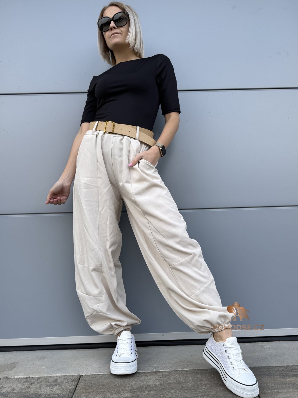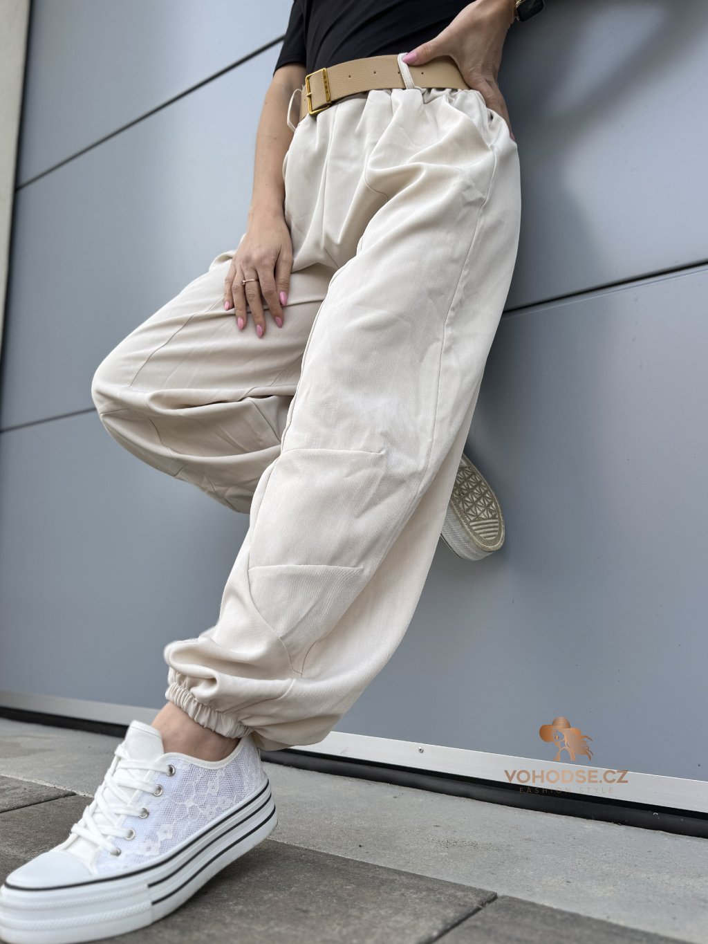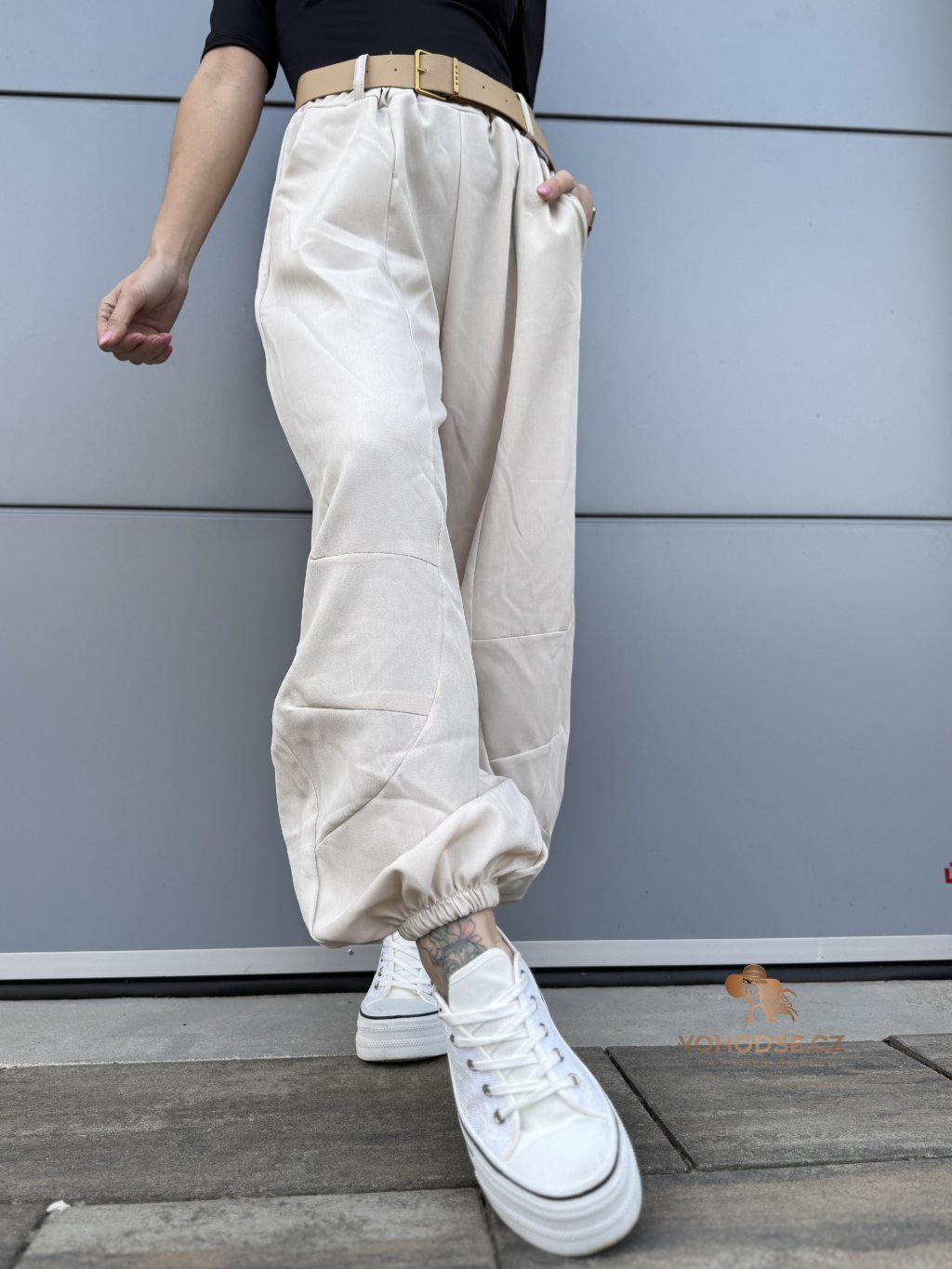 Stylové a pohodlné kalhoty, které skvěle doplní váš každodenní outfit. Volnější střih zajišťuje maximální komfort při nošení a spodní část nohavic je zakončena jemnou gumou, díky které kalhoty krásně drží tvar. Kalhoty jsou doplněny páskem, který zvýrazní pas a dodá outfitu elegantní vzhled.
