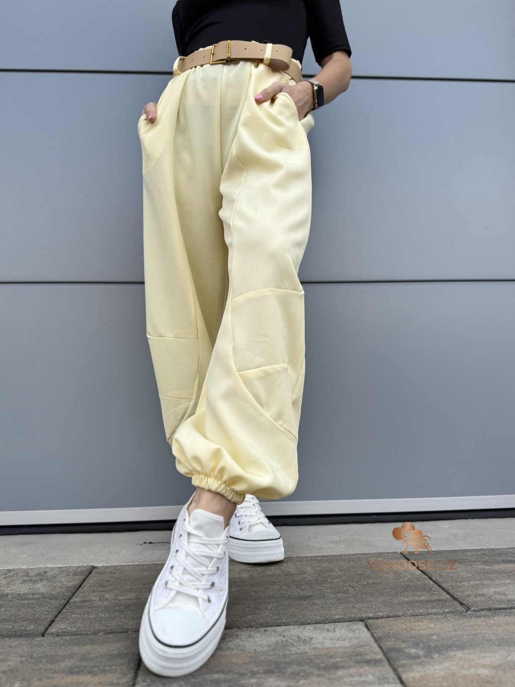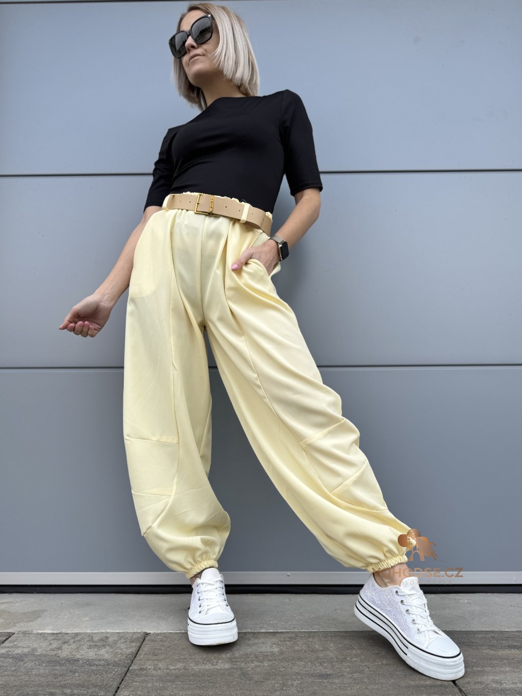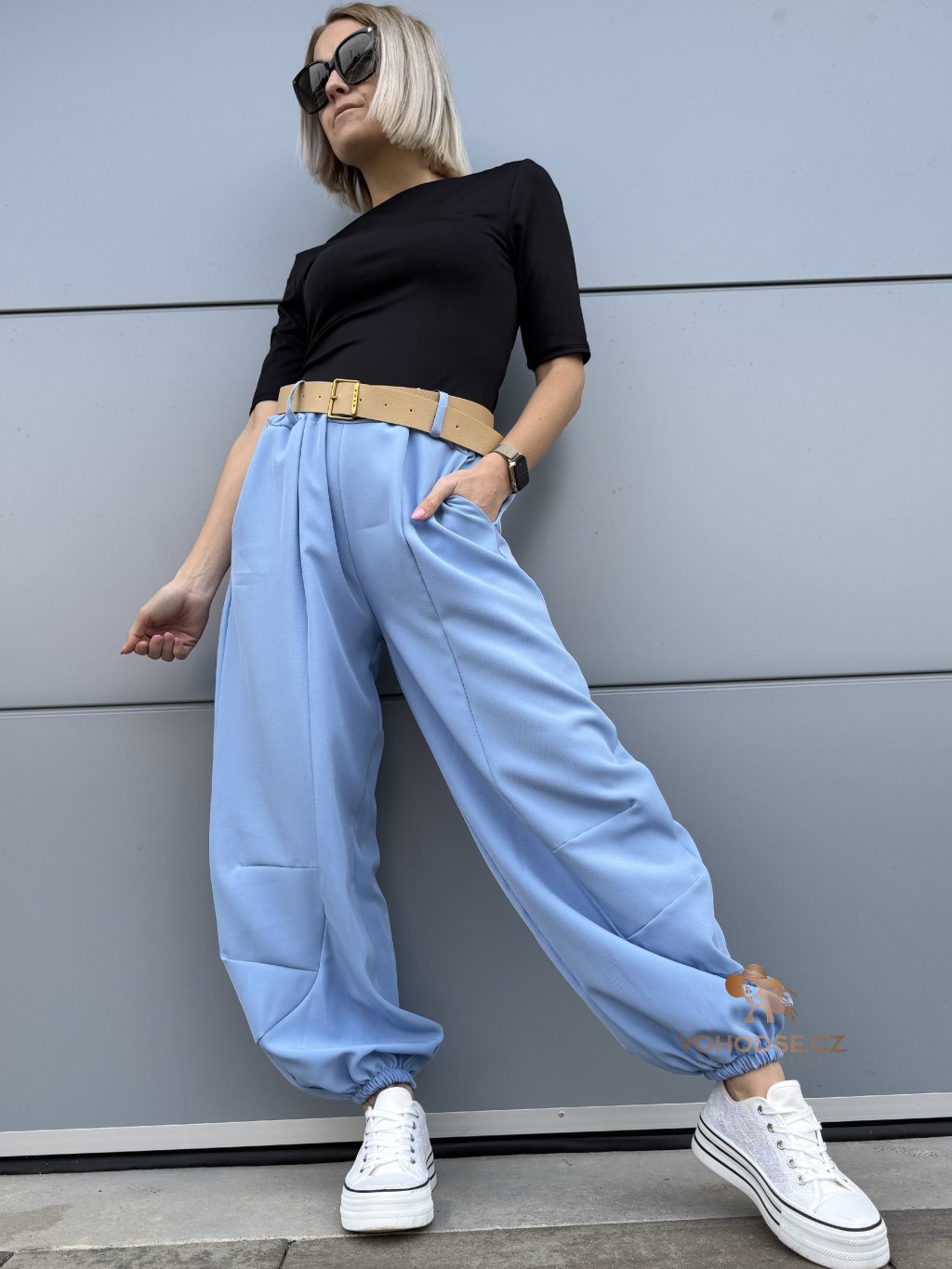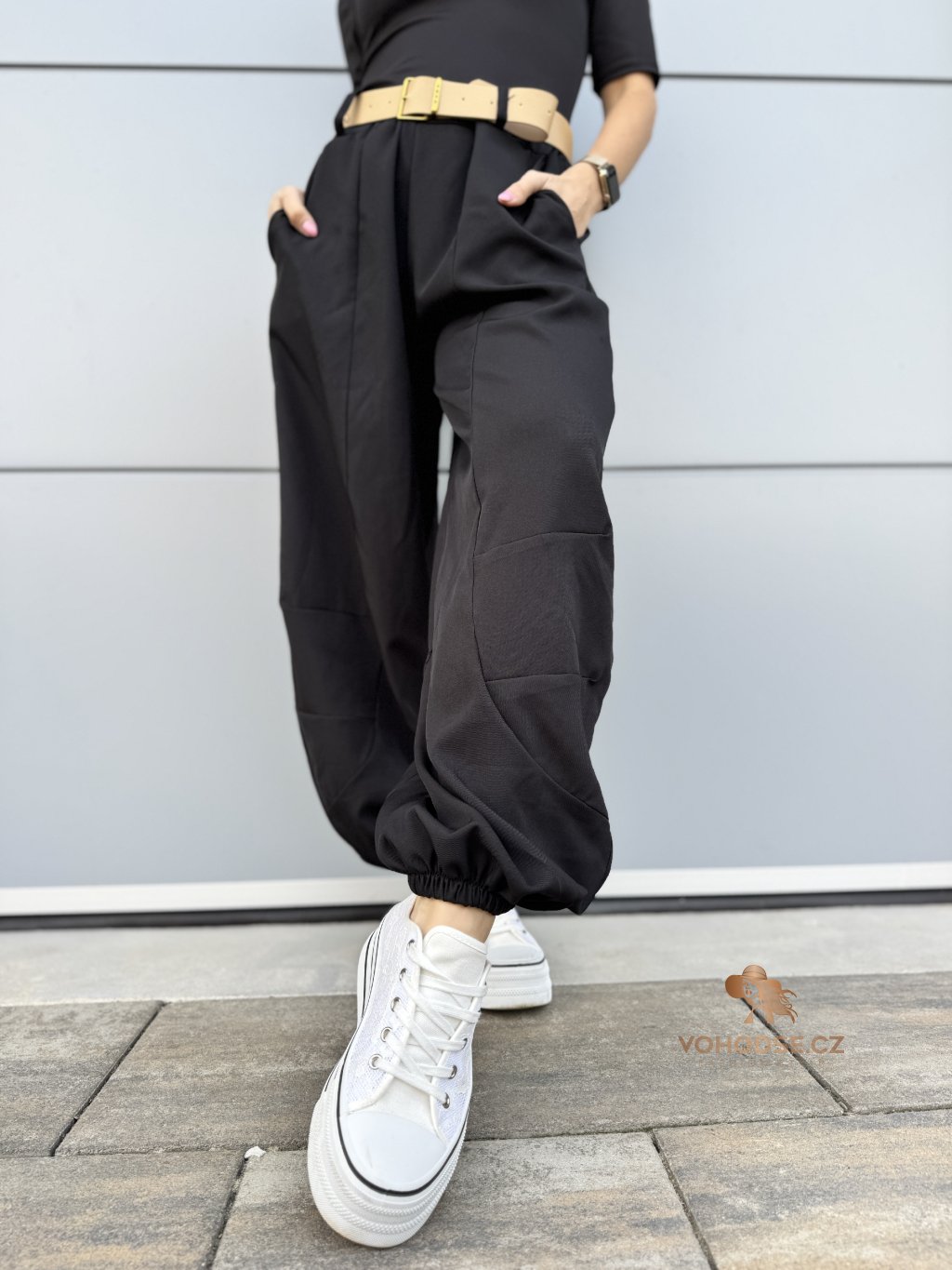 Stylové a pohodlné kalhoty, které skvěle doplní váš každodenní outfit. Volnější střih zajišťuje maximální komfort při nošení a spodní část nohavic je zakončena jemnou gumou, díky které kalhoty krásně drží tvar. Kalhoty jsou doplněny páskem, který zvýrazní pas a dodá outfitu elegantní vzhled.