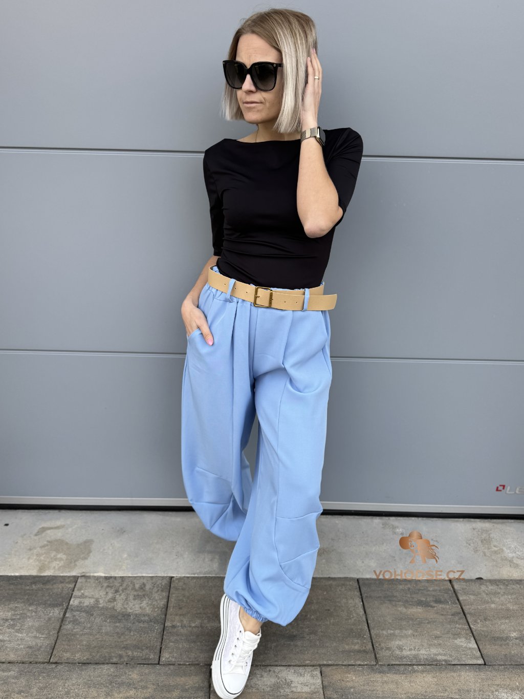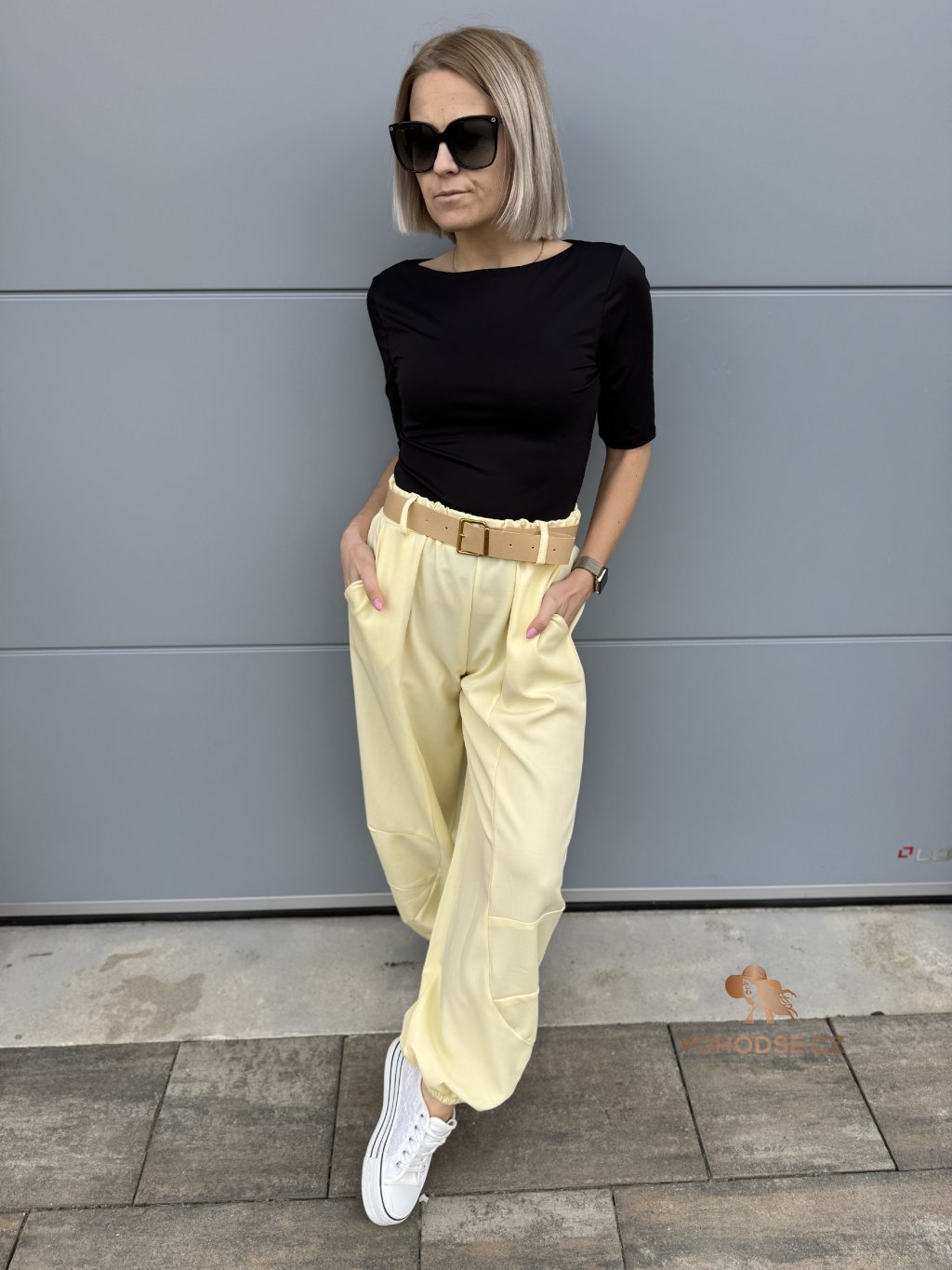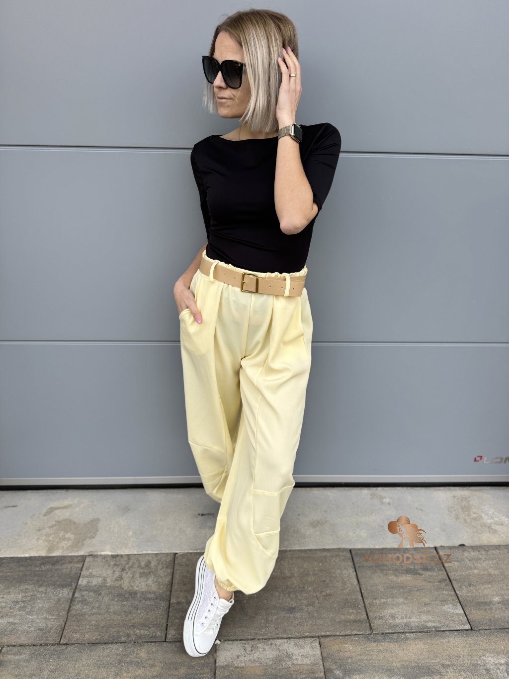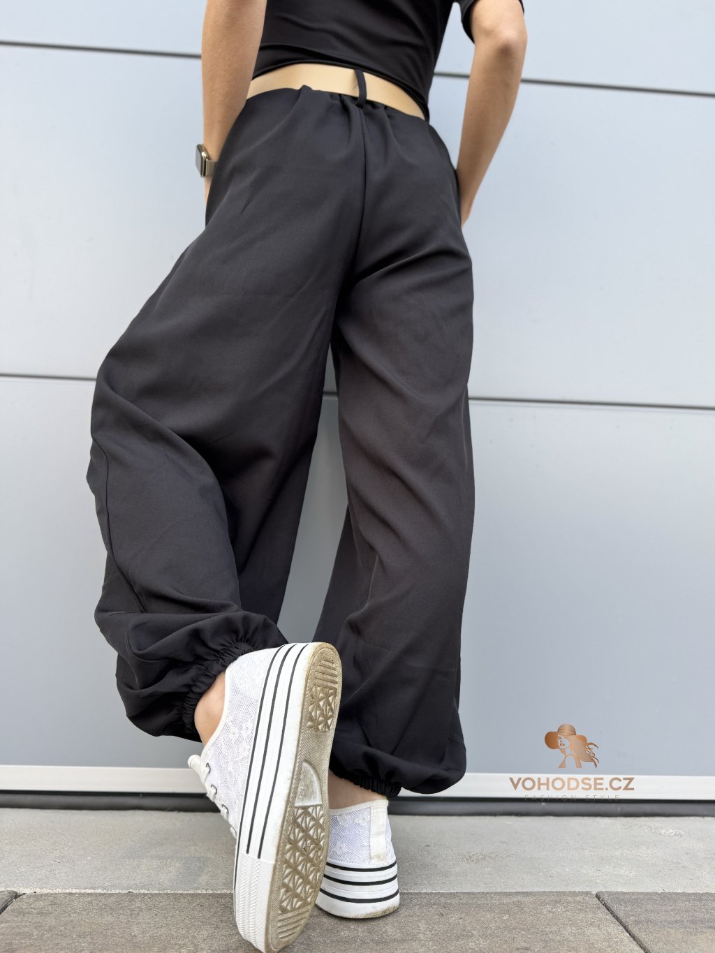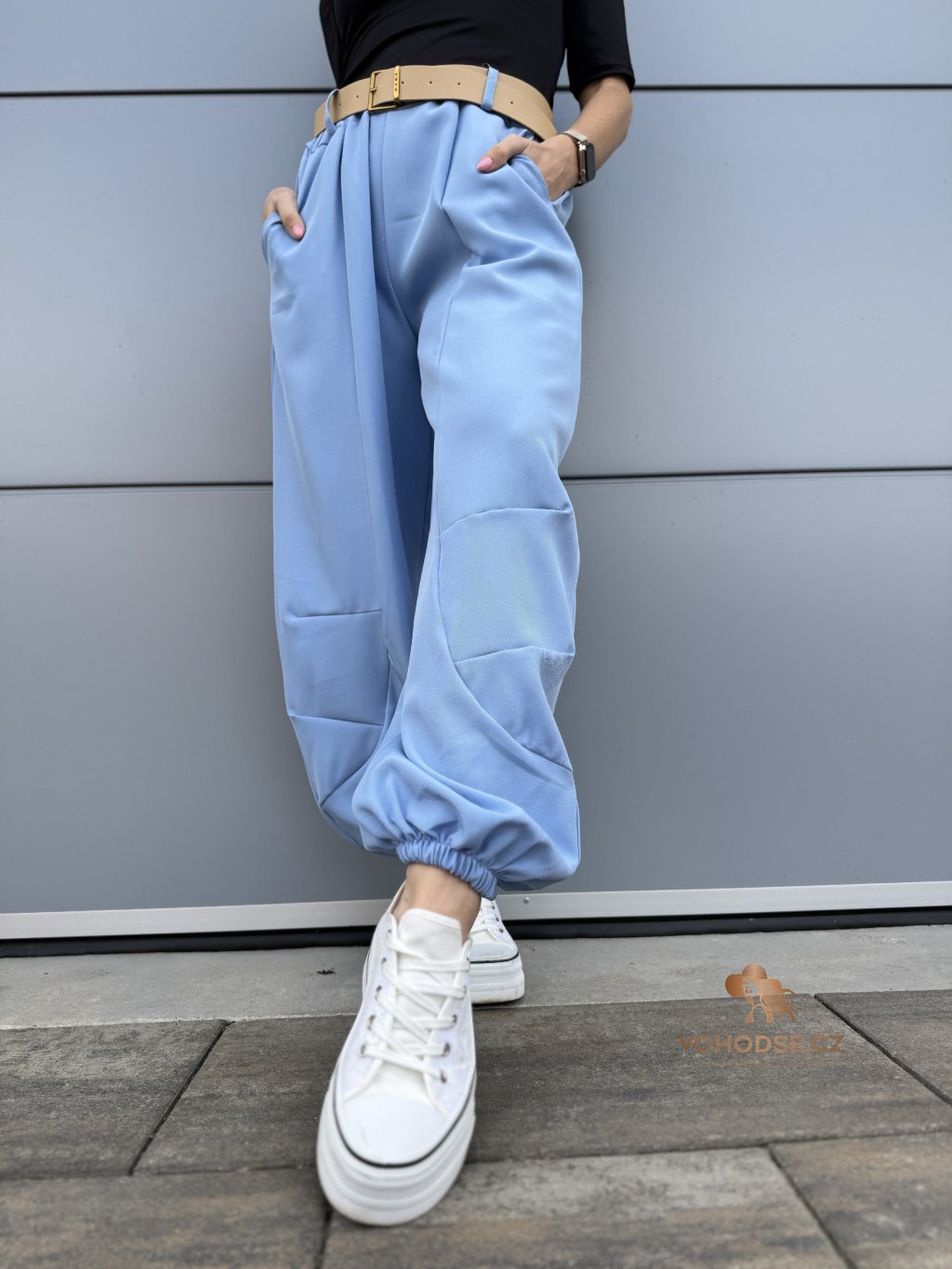 Stylové a pohodlné kalhoty, které skvěle doplní váš každodenní outfit. Volnější střih zajišťuje maximální komfort při nošení a spodní část nohavic je zakončena jemnou gumou, díky které kalhoty krásně drží tvar. Kalhoty jsou doplněny páskem, který zvýrazní pas a dodá outfitu elegantní vzhled.