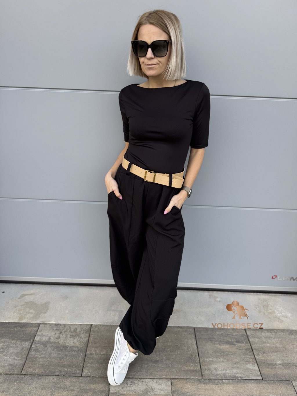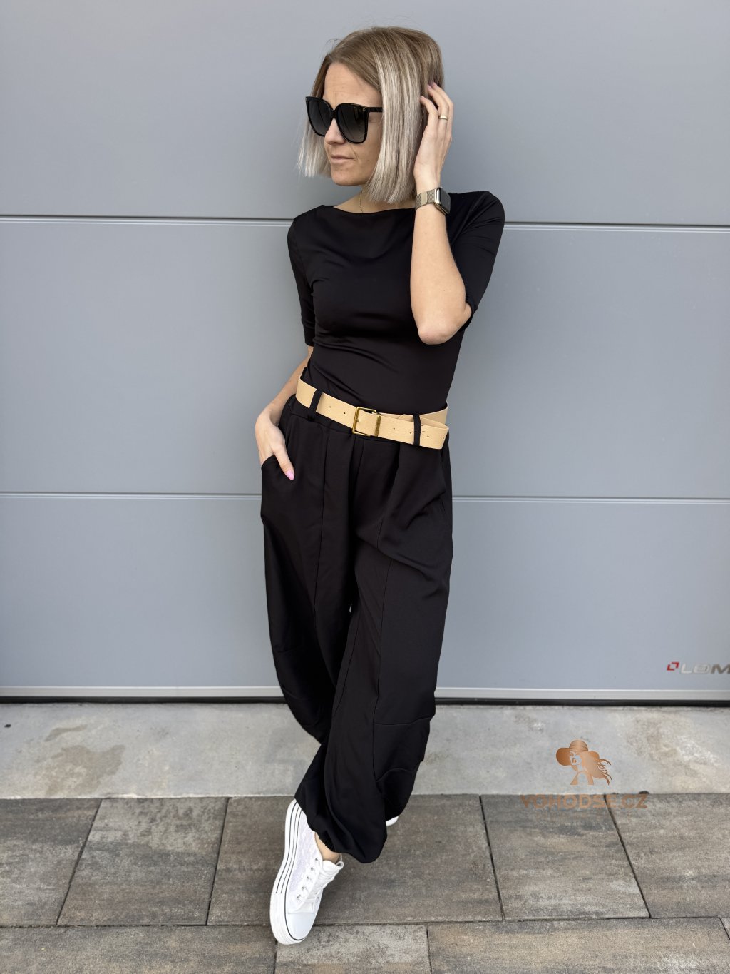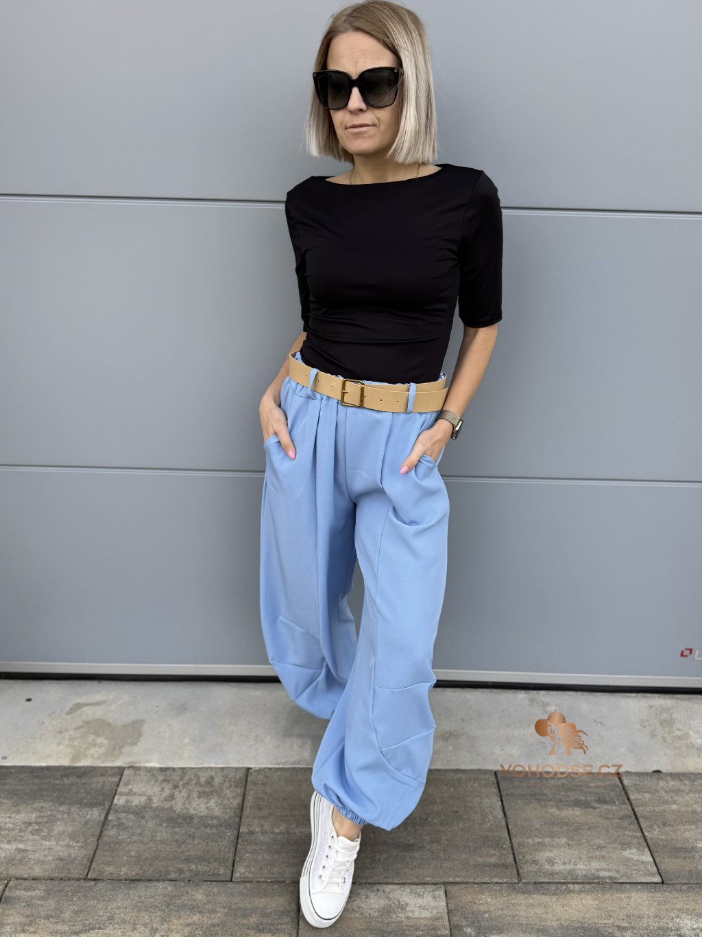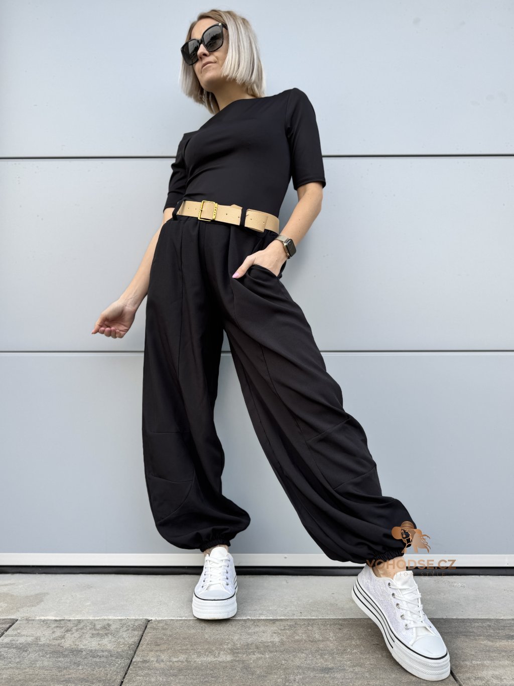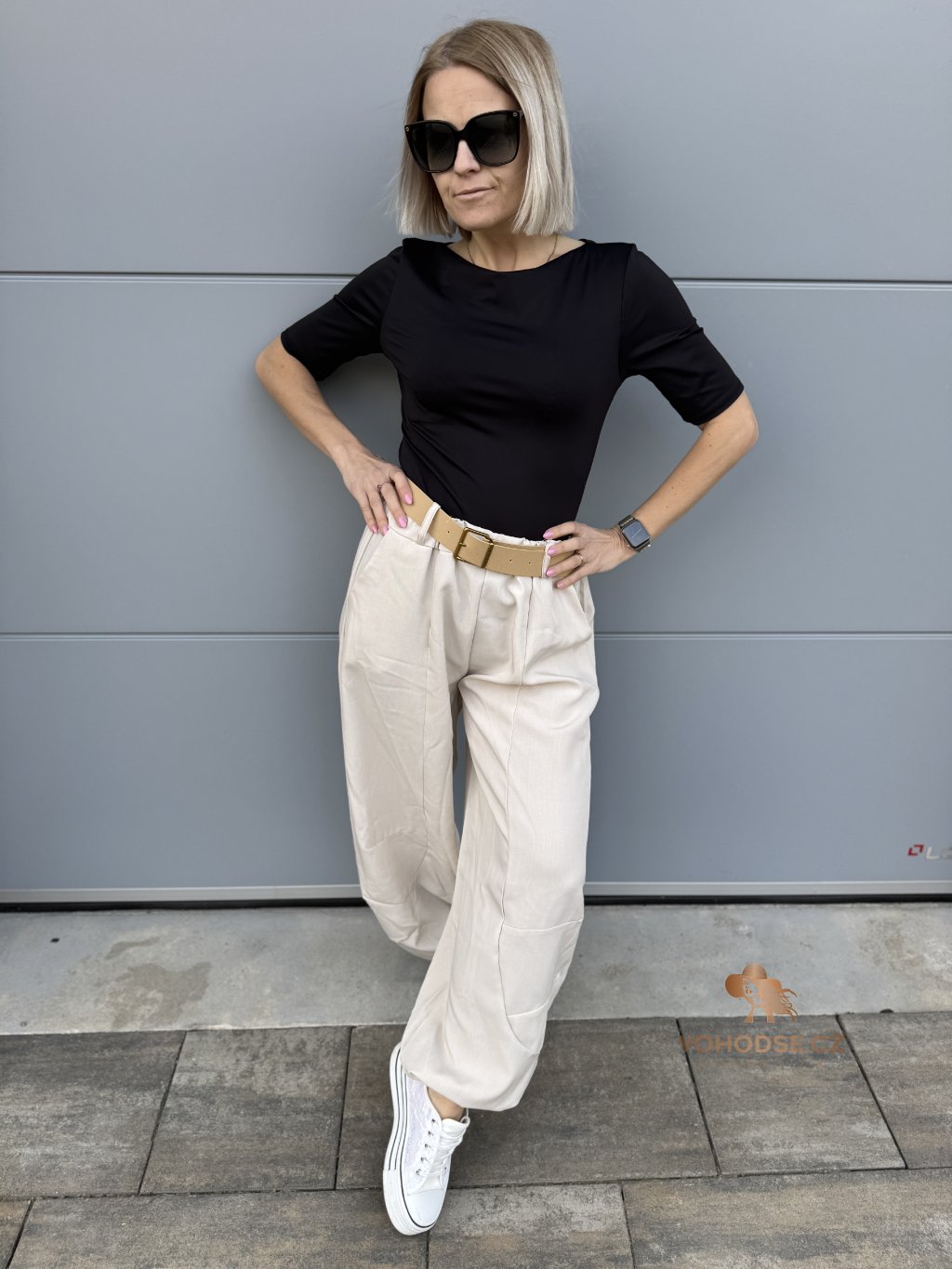 Stylové a pohodlné kalhoty, které skvěle doplní váš každodenní outfit. Volnější střih zajišťuje maximální komfort při nošení a spodní část nohavic je zakončena jemnou gumou, díky které kalhoty krásně drží tvar. Kalhoty jsou doplněny páskem, který zvýrazní pas a dodá outfitu elegantní vzhled.