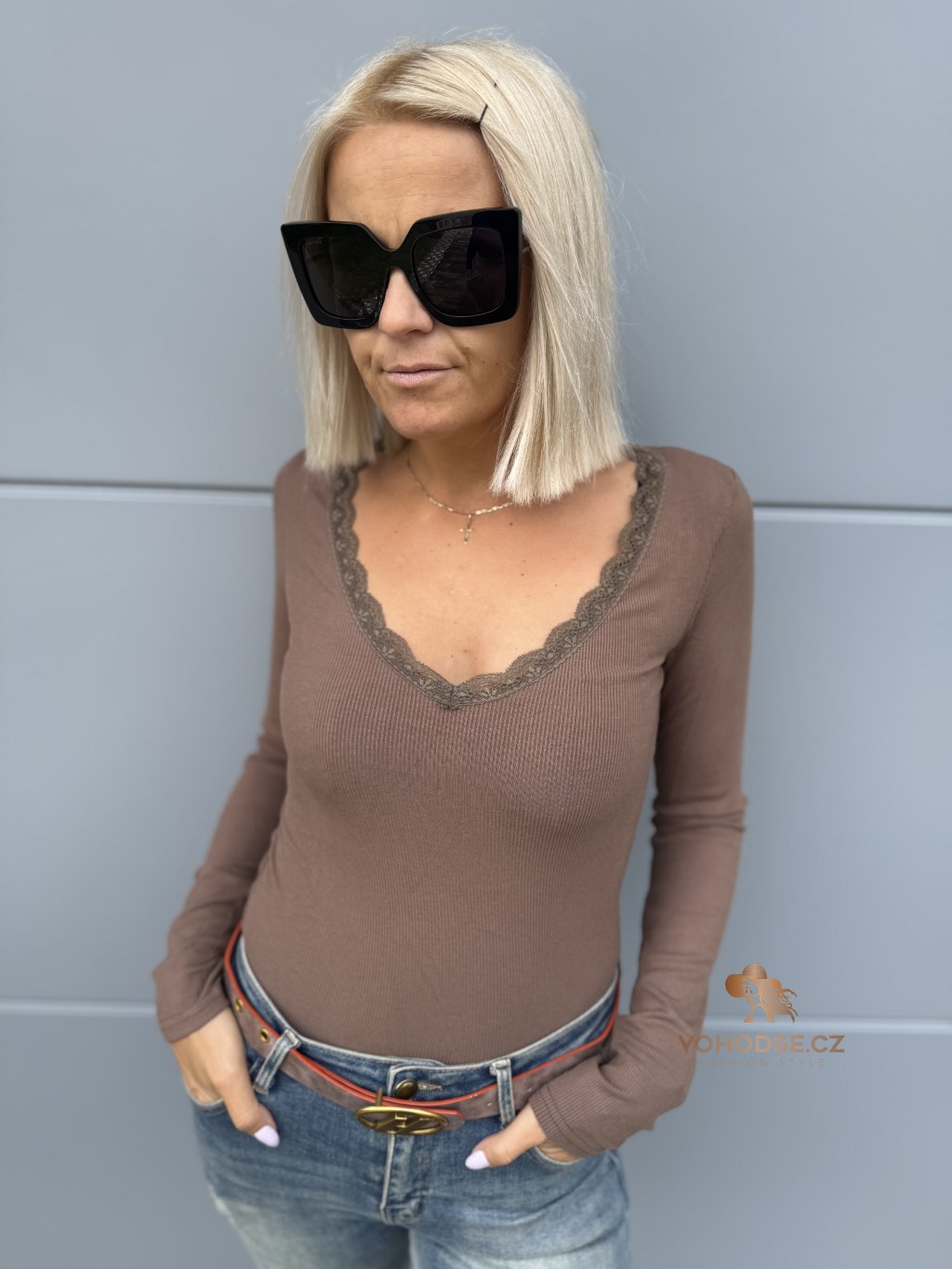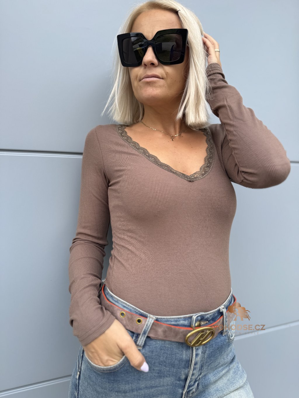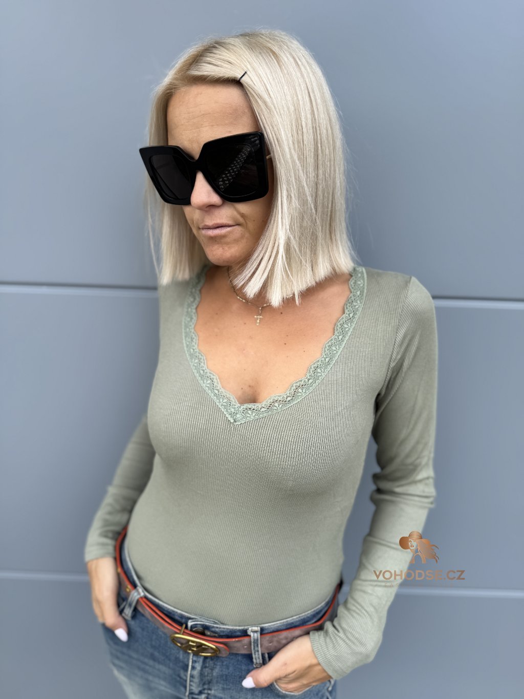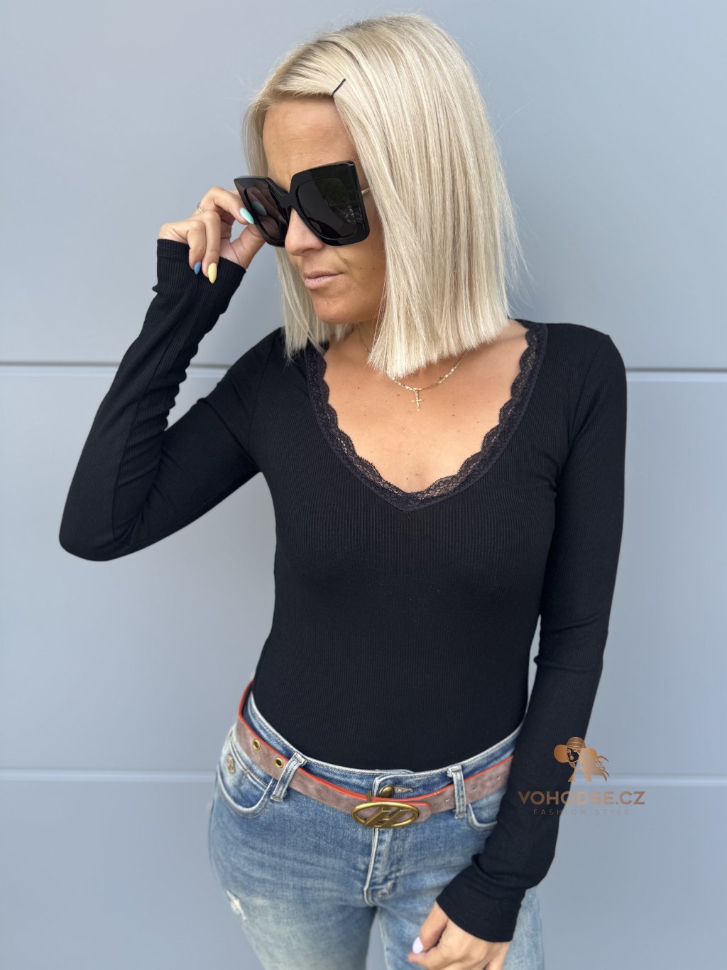 - Výstřih do V zdoben jemnou krajkou