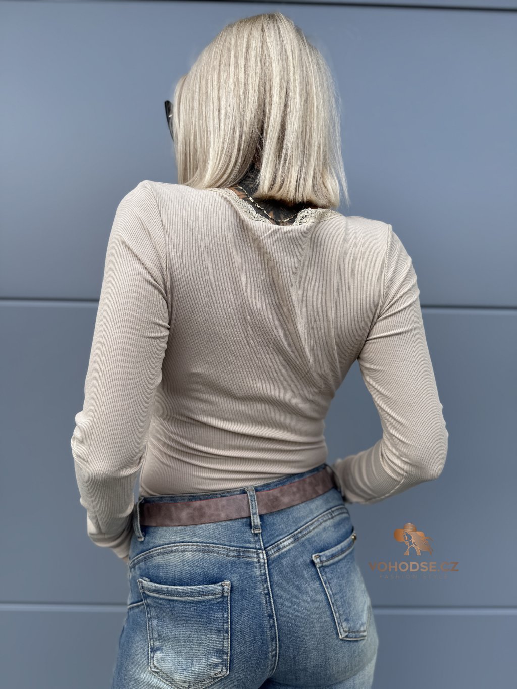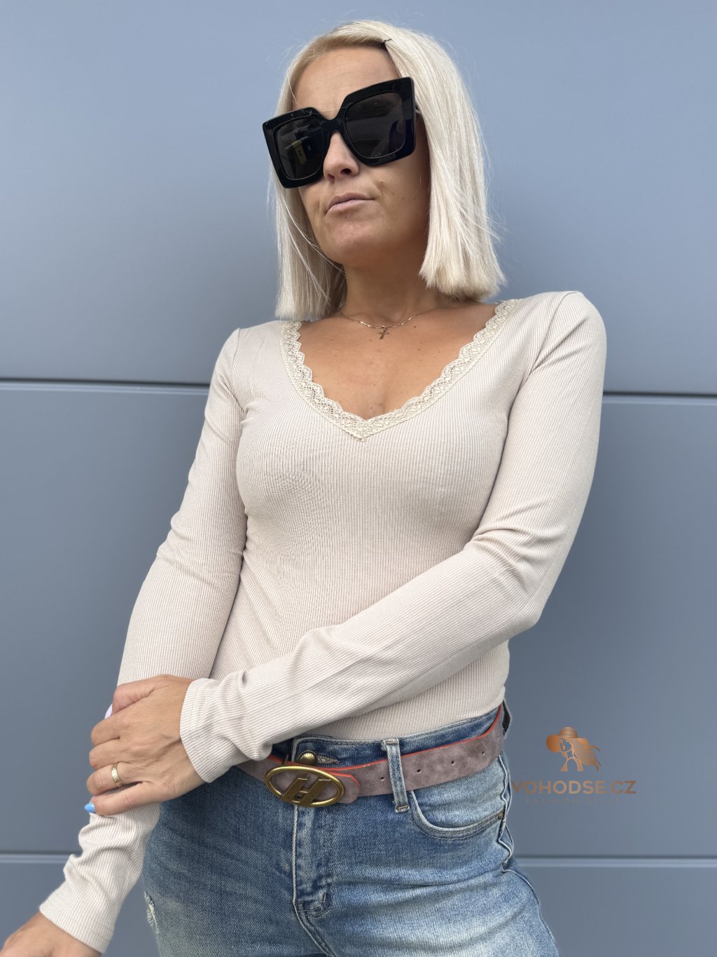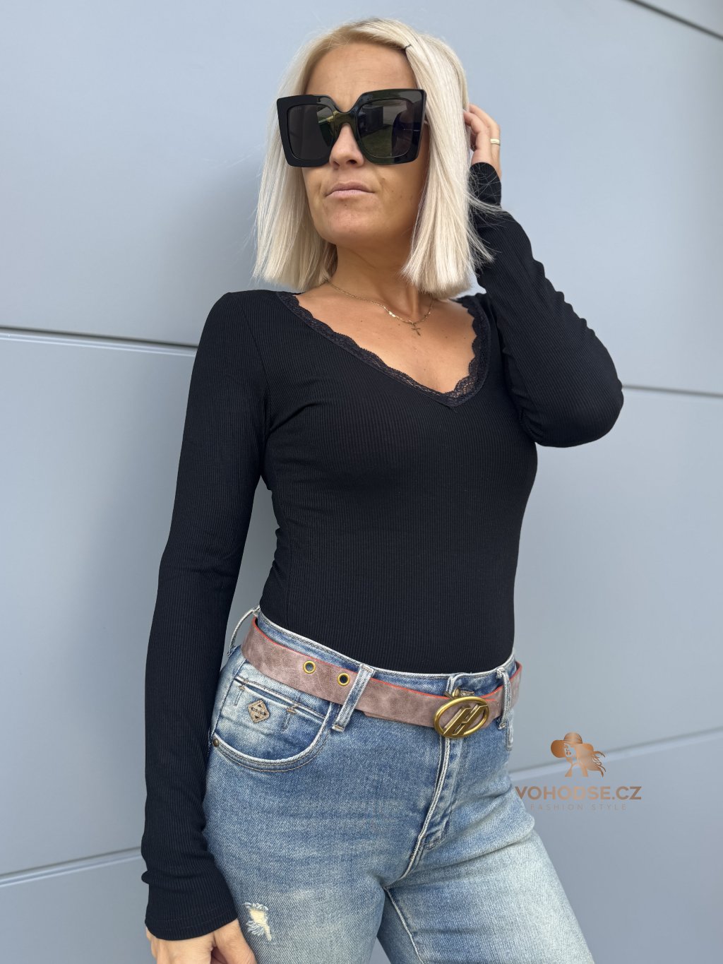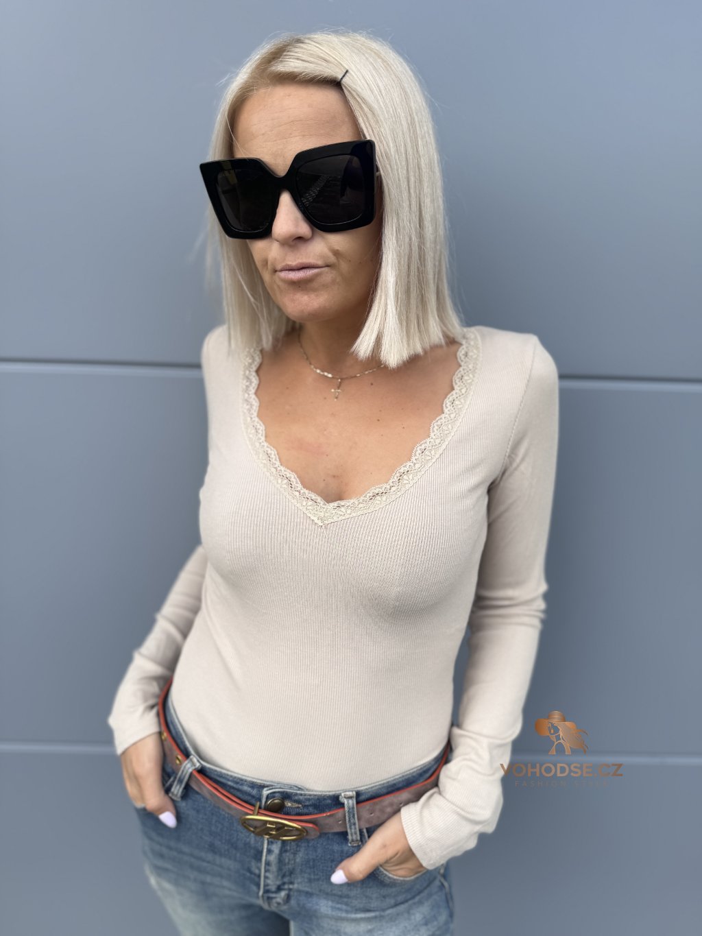 - Výstřih do V zdoben jemnou krajkou
