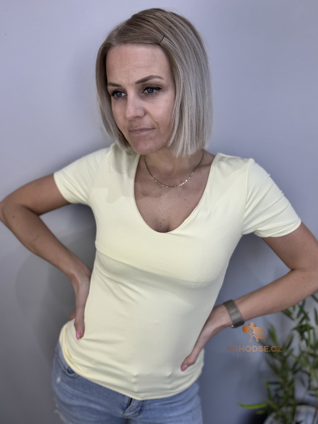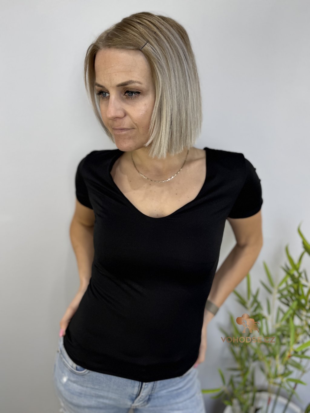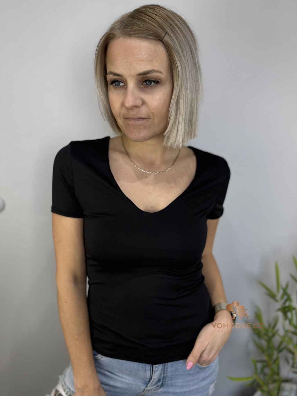 Must-have kousek, který by neměl chybět v žádném šatníku. Jednoduché, přiléhavé tričko s výstřihem do V krásně zvýrazní dekolt a díky pružnému materiálu se dokonale přizpůsobí postavě.