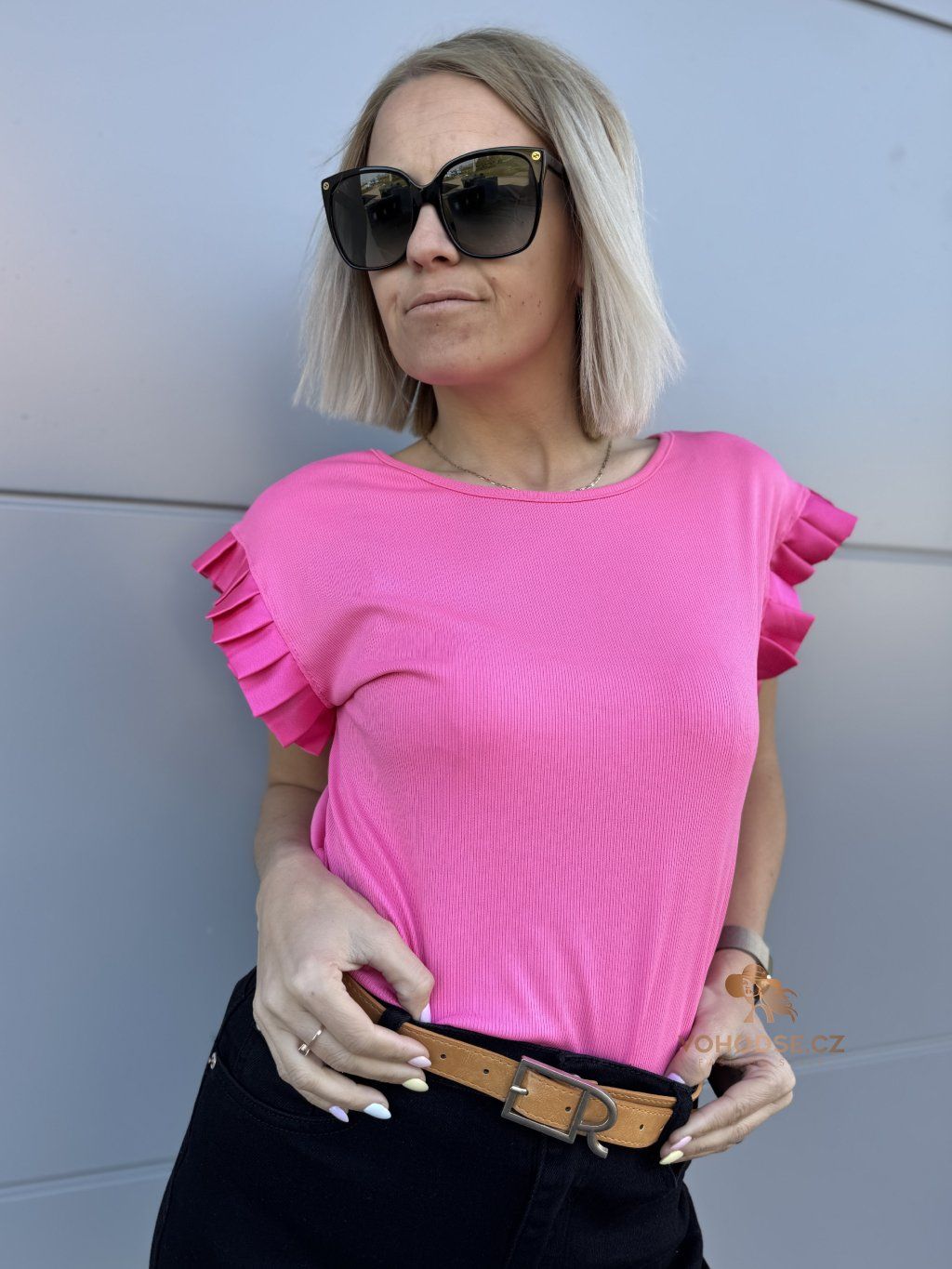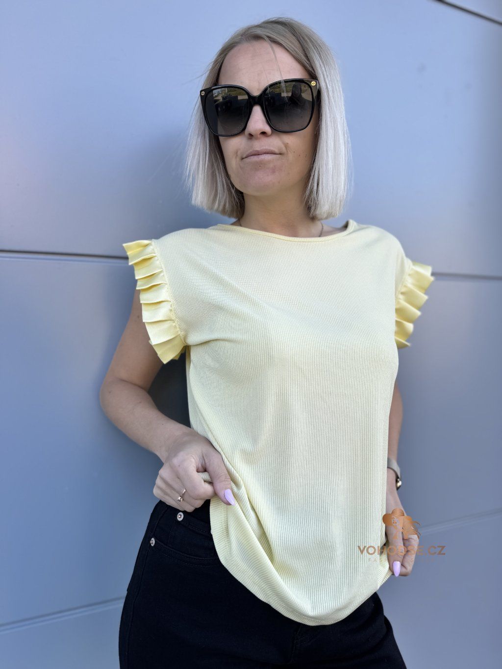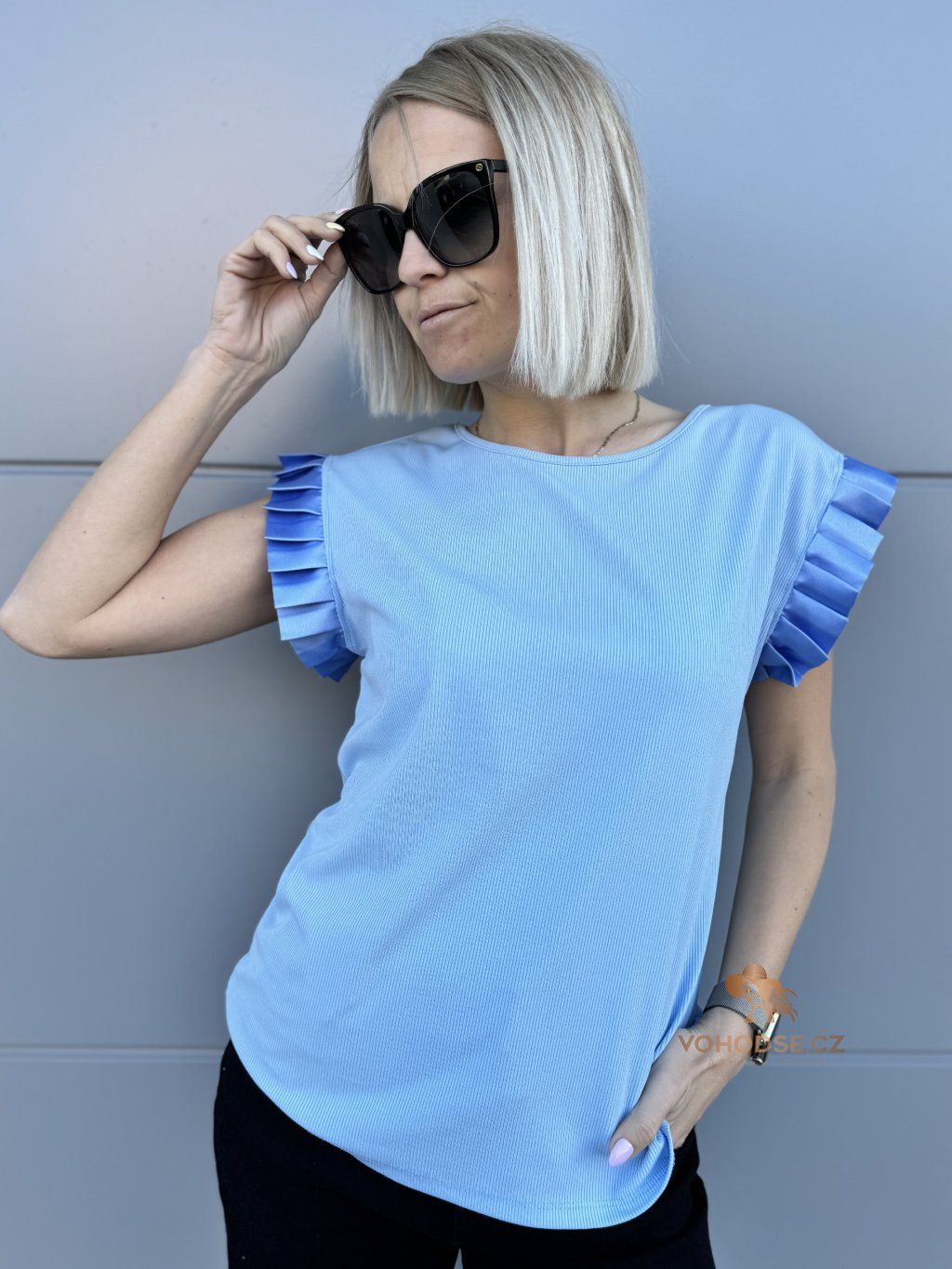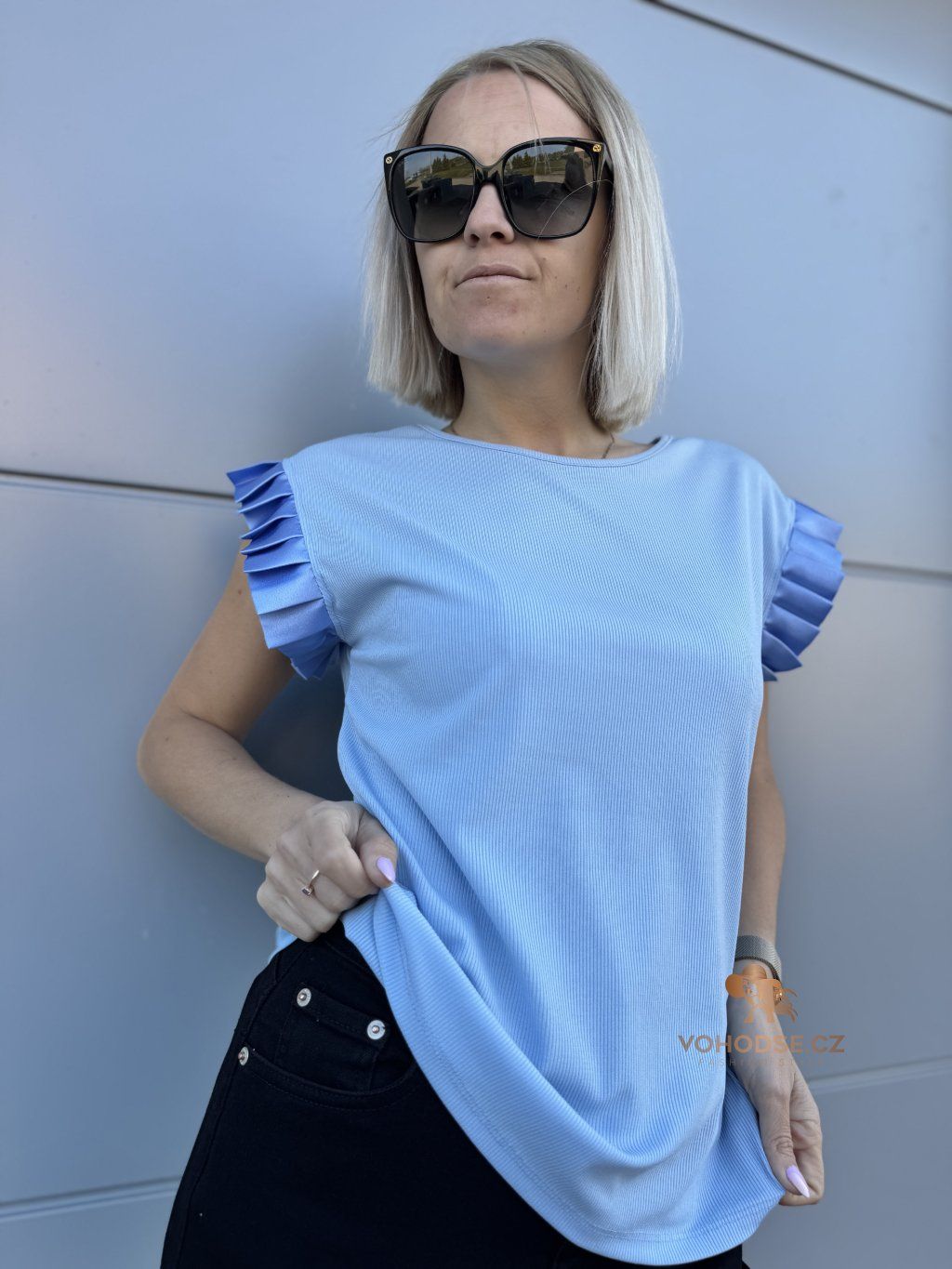 Tričko, které zaujme na první pohled. JEdnoduchý střih doplněný o výrazné řasené rukávy dodává celému outfitu šmrnc a originalitu. Díky příjemnému, lehkému materiálu se skvěle nosí a krásně splývá.