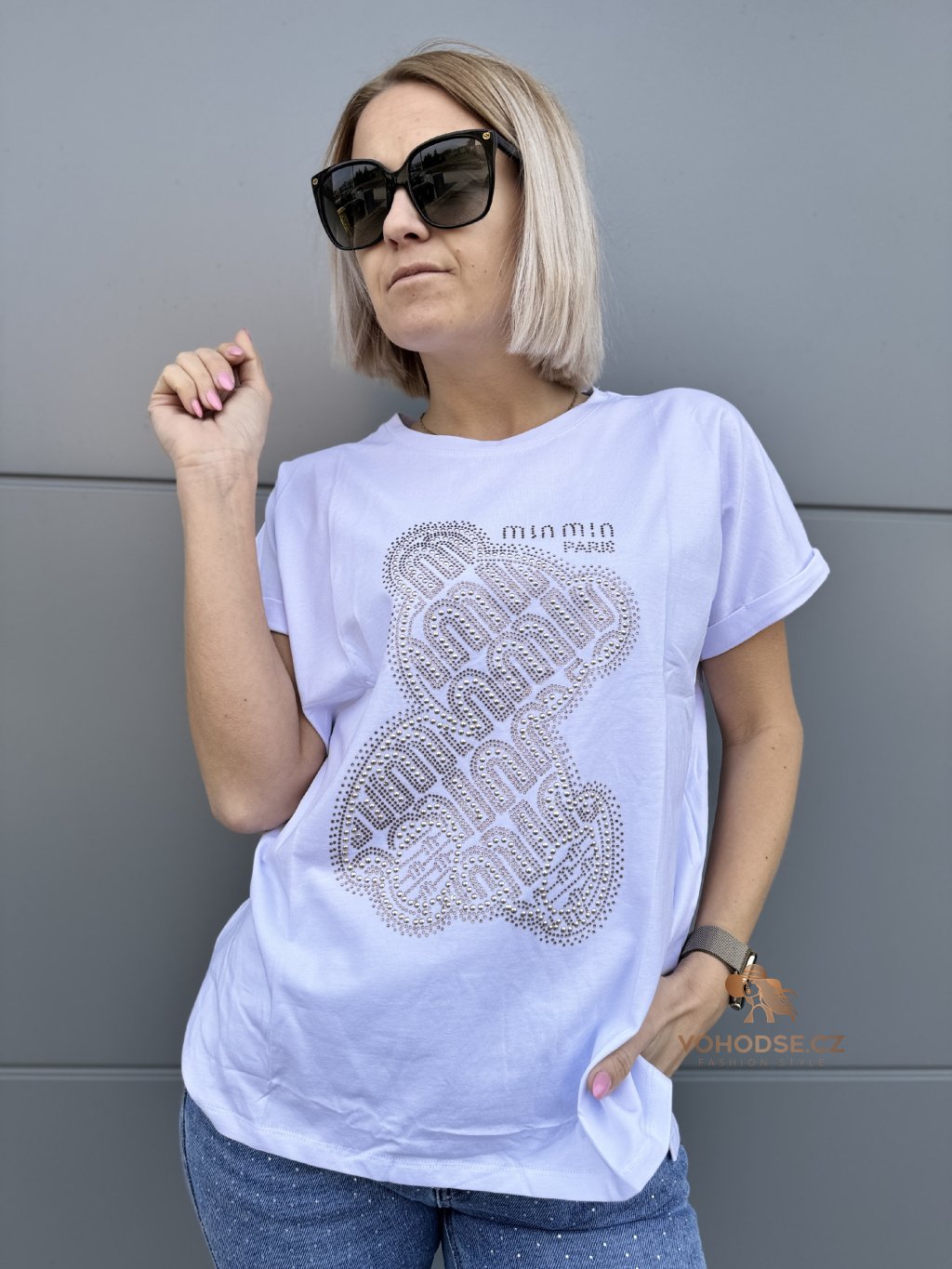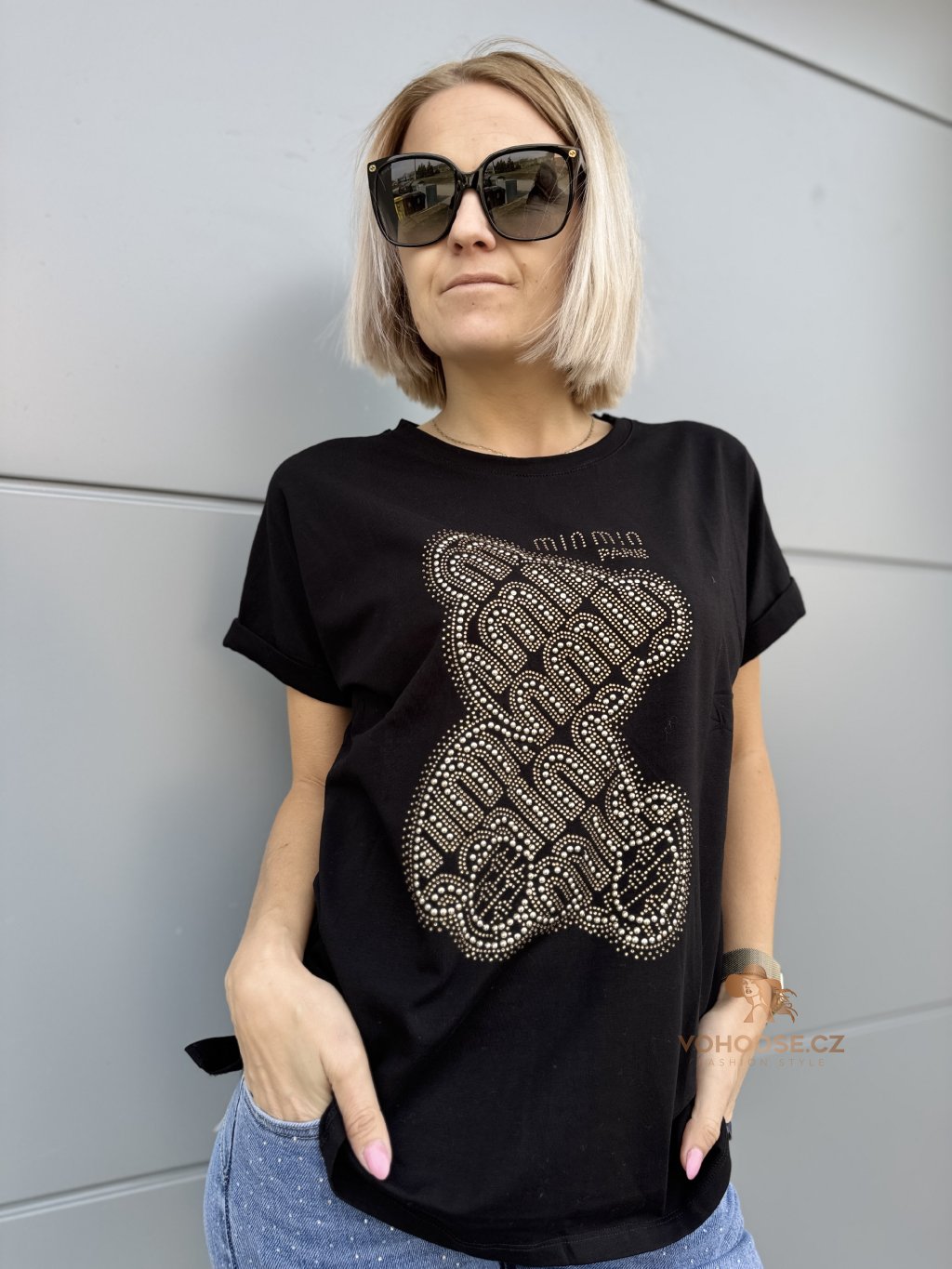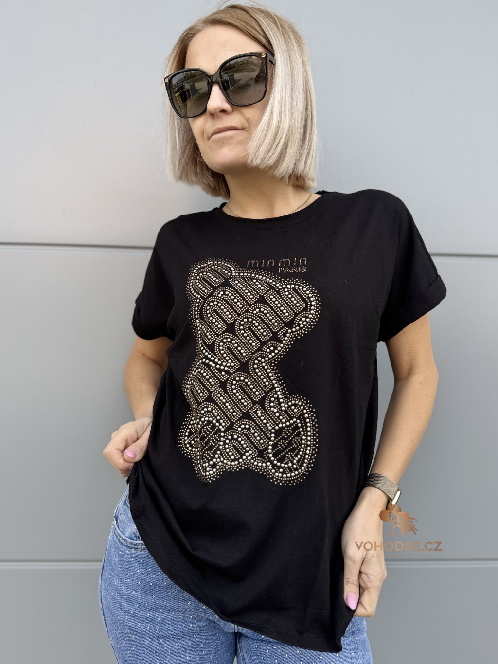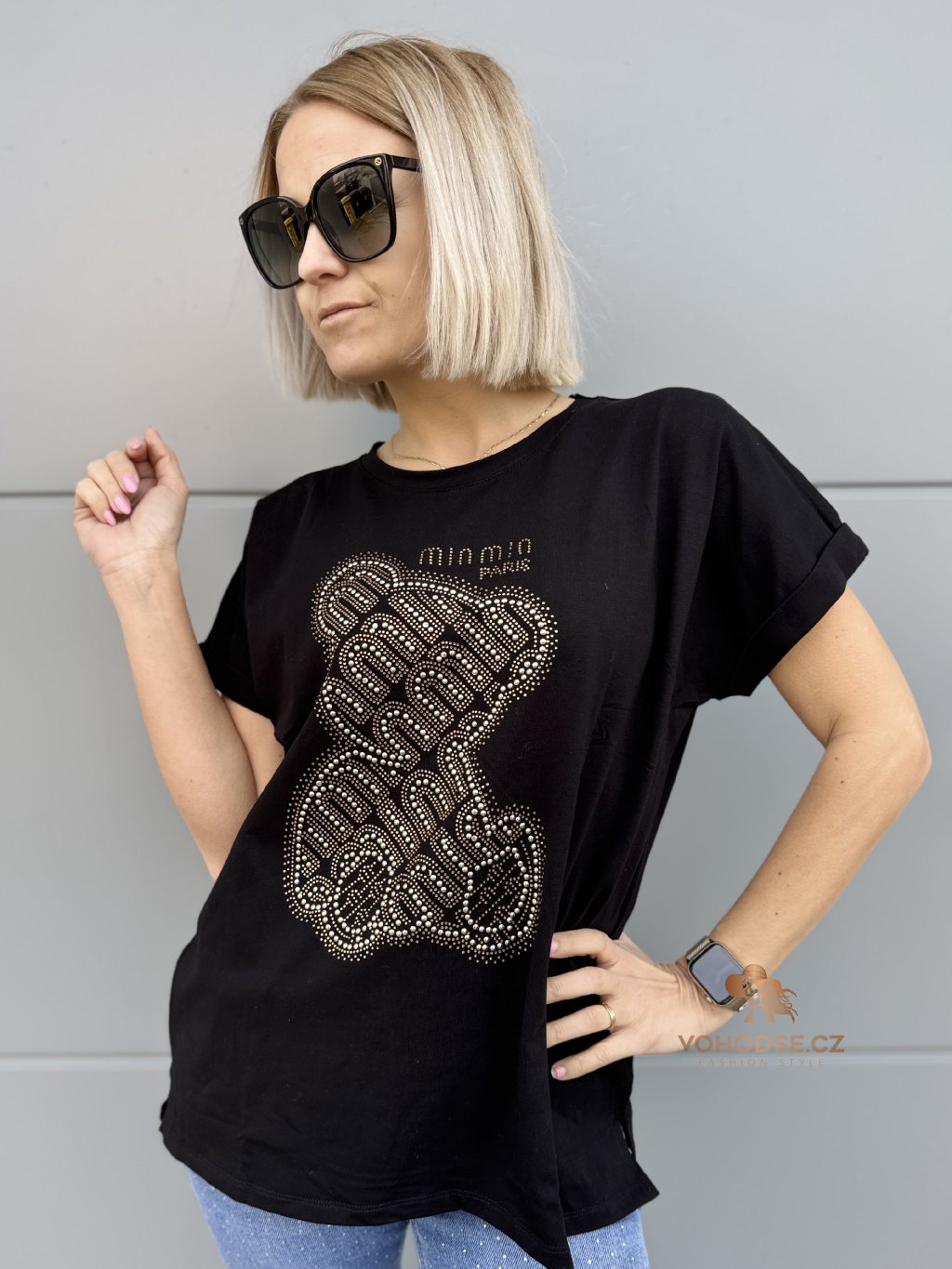 Stylové tričko, které zaujme na první pohled. Dominantou je výrazný motiv medvídka tvořený jemnými kamínky, které dodávají tričku elegantní a originální vzhle. Volnější střih zajišťuje pohodlí při nošení a zároveň skvěle sedí k džínům, šortkám i sukním.