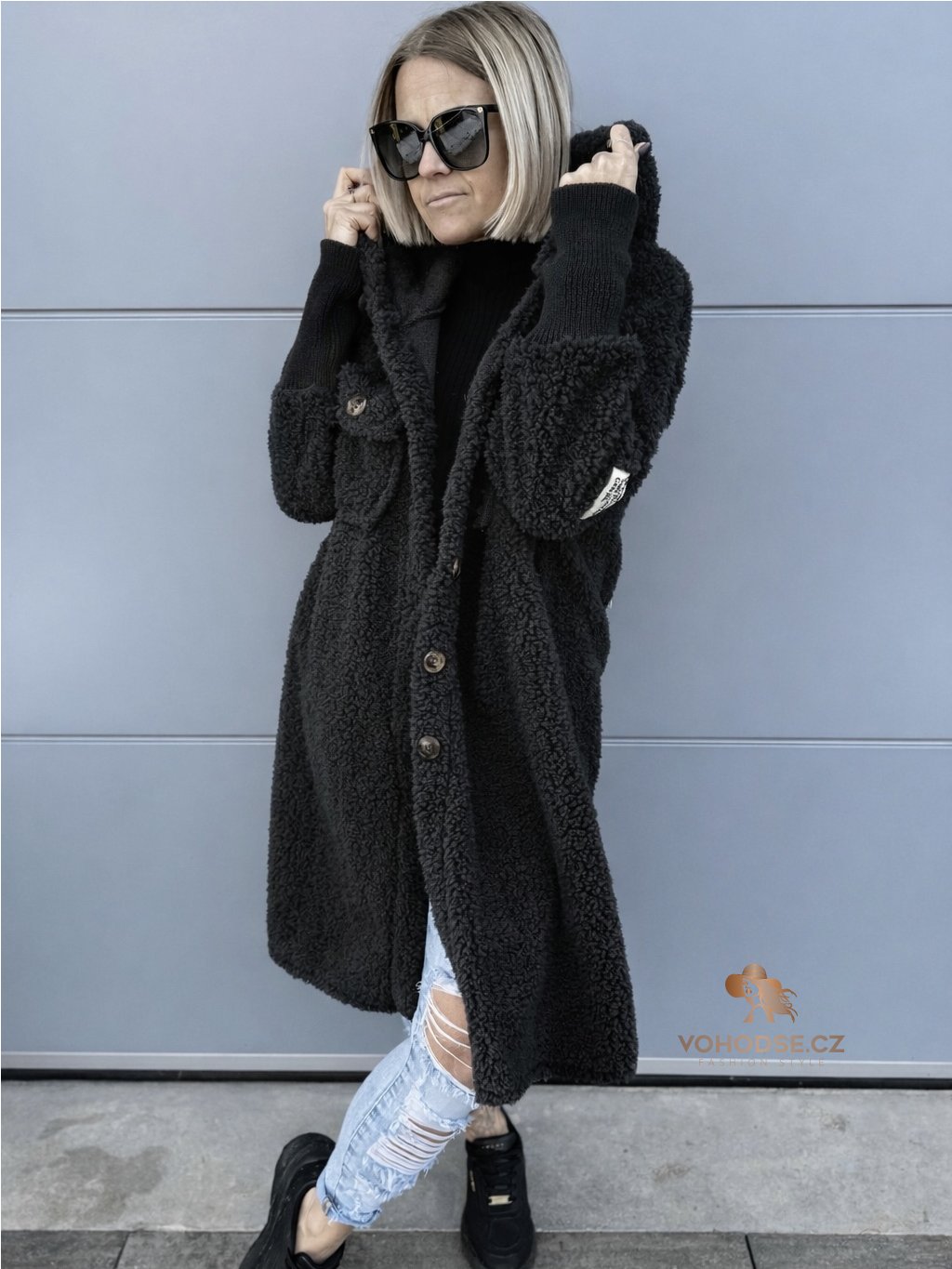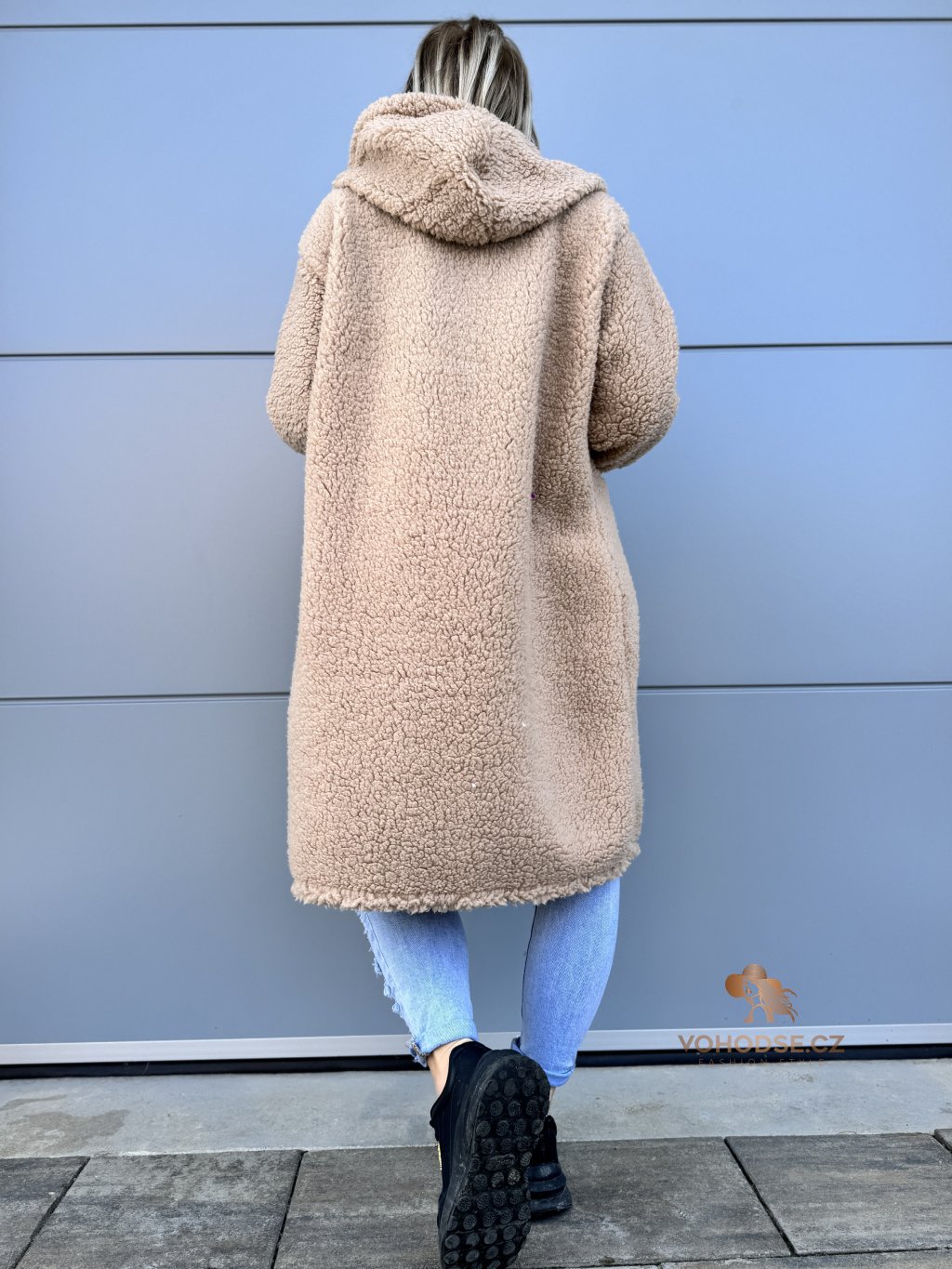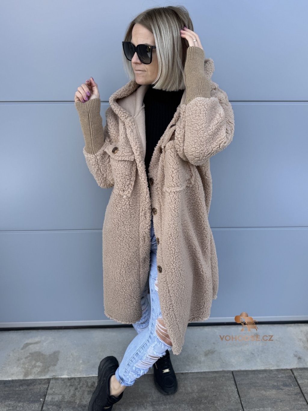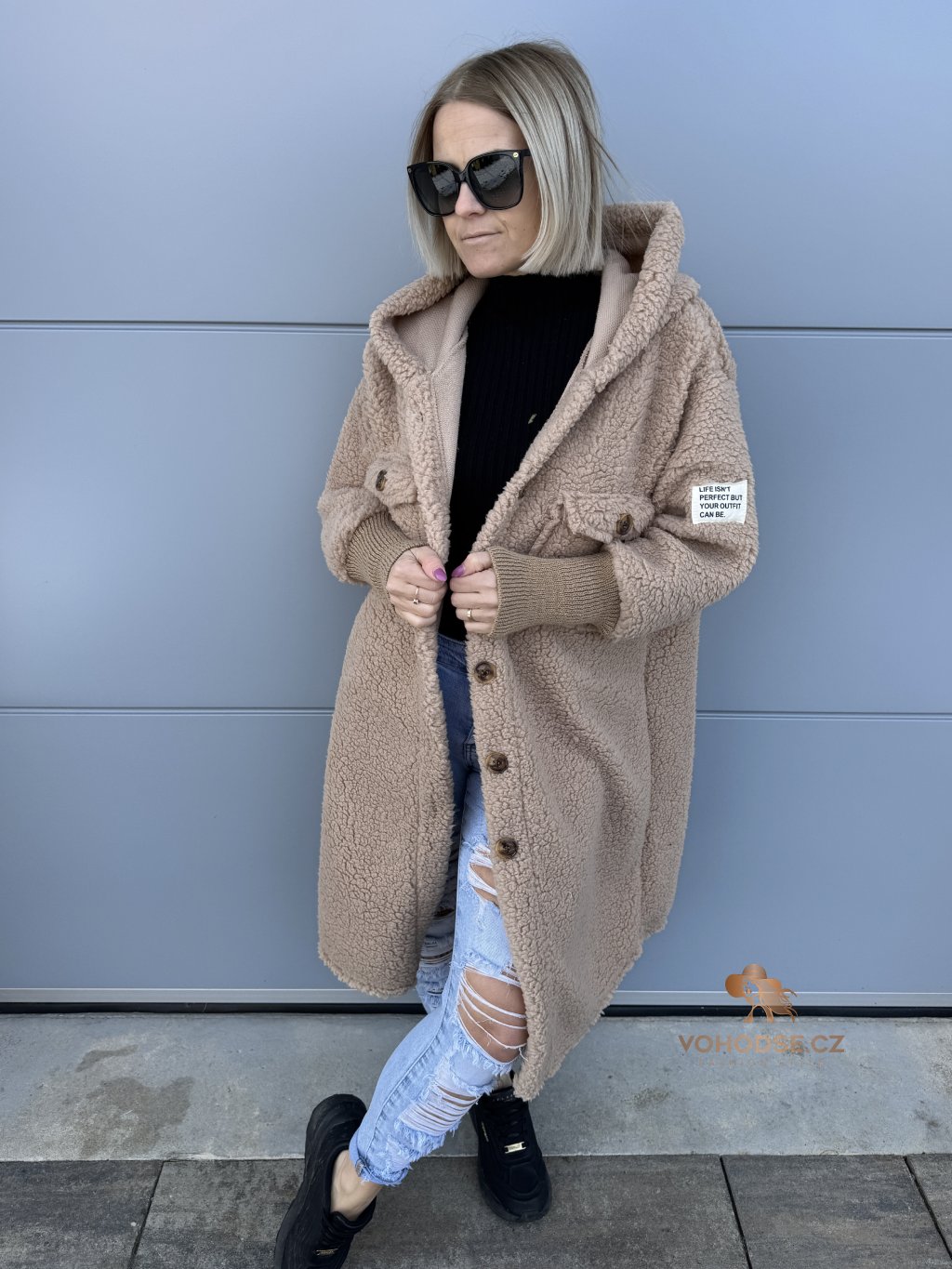 Stylový teddy kabát s kapucí je perfektní volbou pro chladnější dny kdy chcete vypadat skvěle. Měkoučký materiál je velmi příjemný na dotek a poskytuje maximální komfort při nošení. Delší střih krásně prodlužuje siluetu a hodí se jak k džínám, tak k legínám či šatům. Kabát ma praktickou kapuci, zapínání na knoflík a přední kapsy.