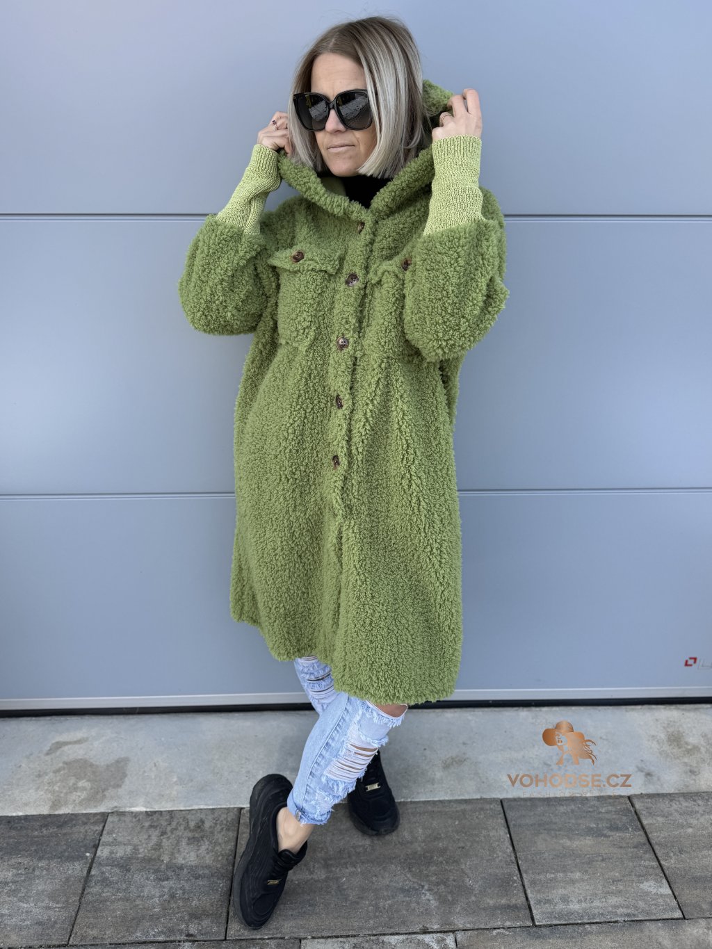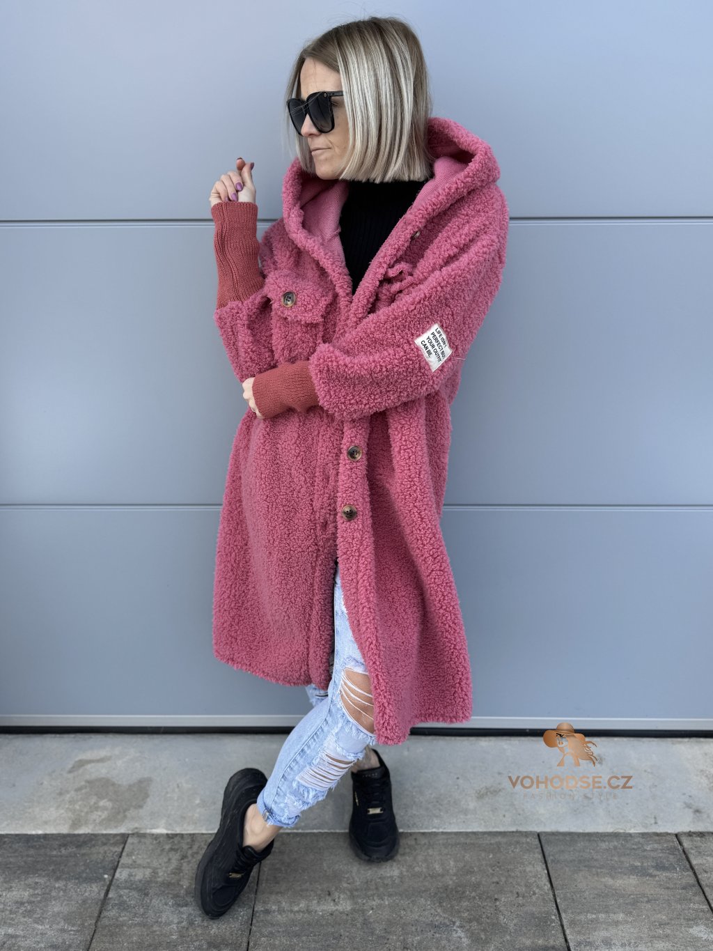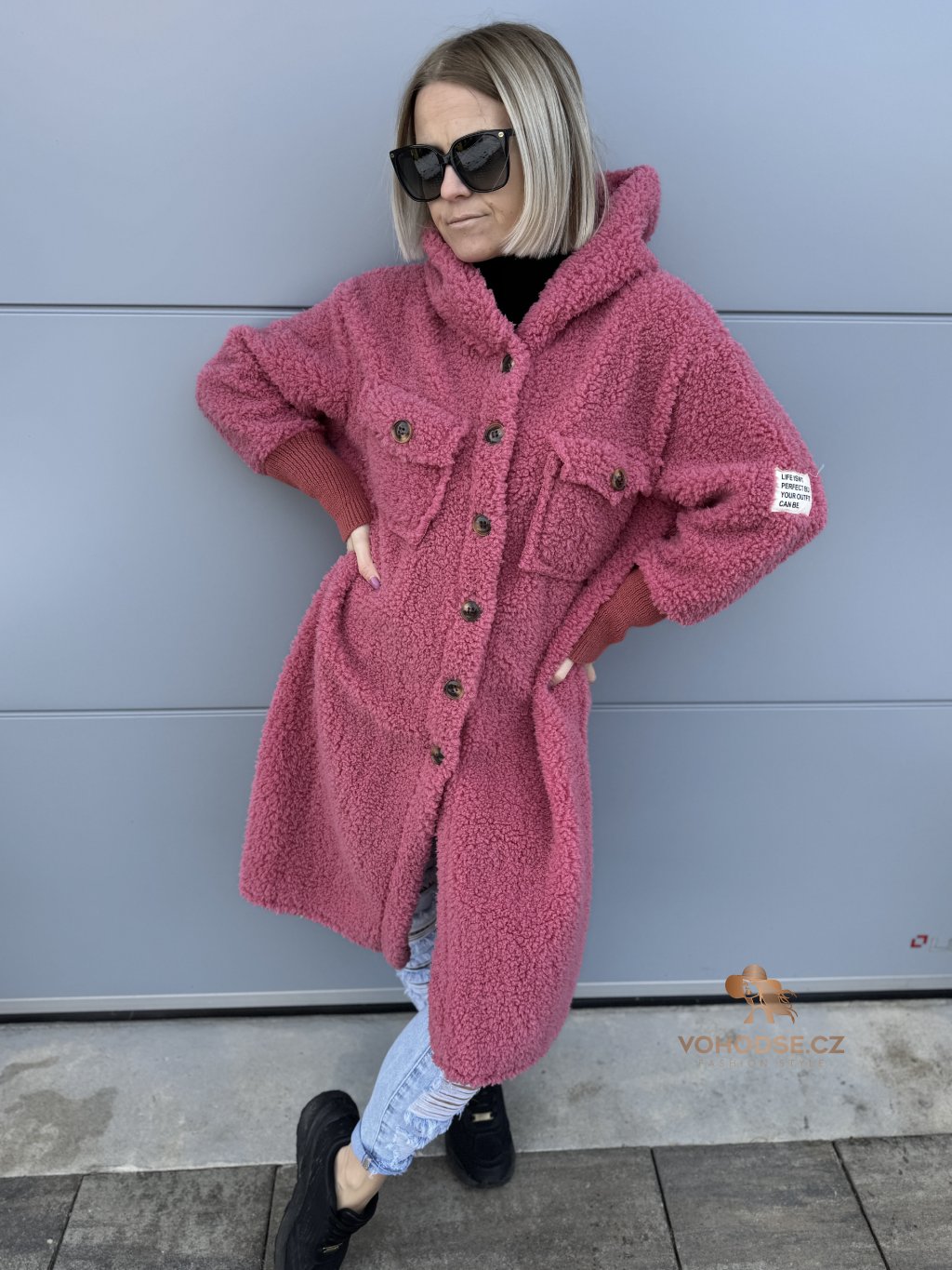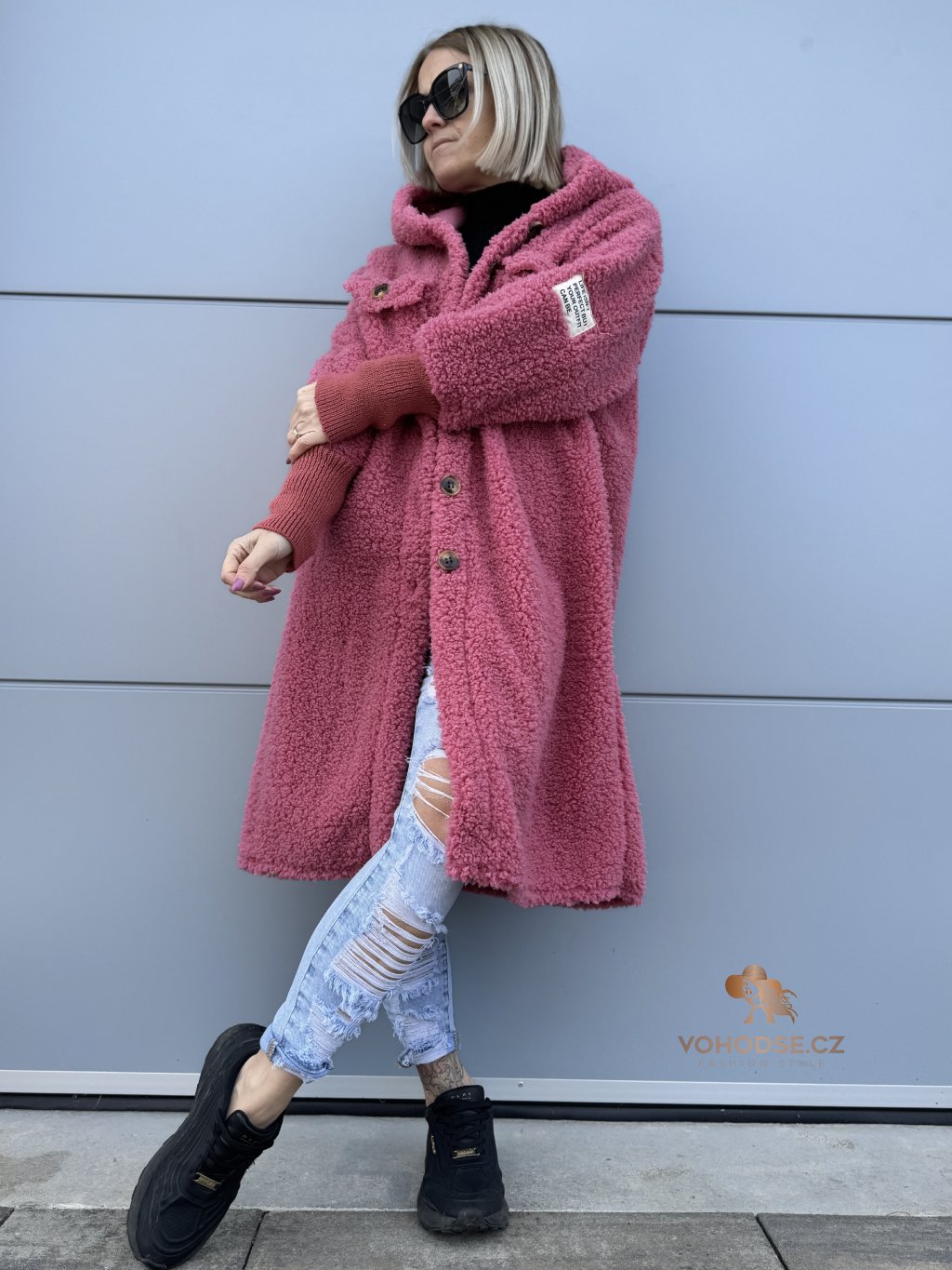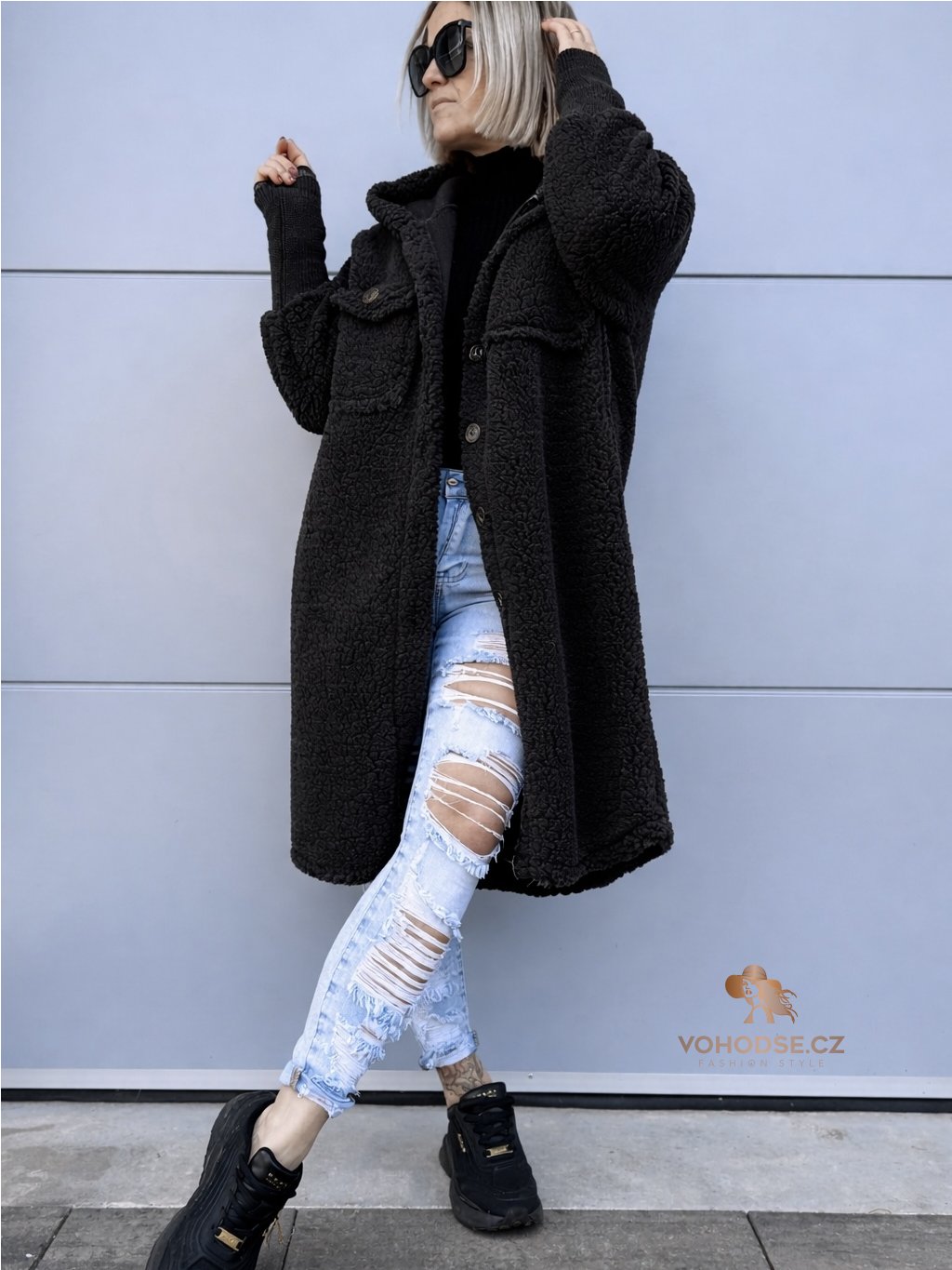 Stylový teddy kabát s kapucí je perfektní volbou pro chladnější dny kdy chcete vypadat skvěle. Měkoučký materiál je velmi příjemný na dotek a poskytuje maximální komfort při nošení. Delší střih krásně prodlužuje siluetu a hodí se jak k džínám, tak k legínám či šatům. Kabát ma praktickou kapuci, zapínání na knoflík a přední kapsy.