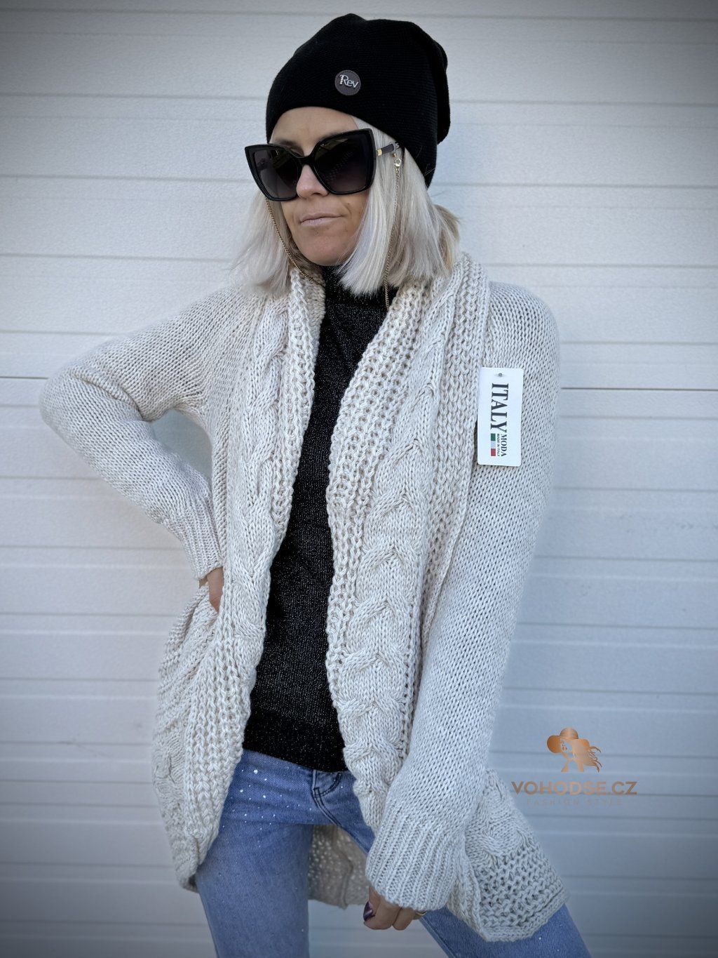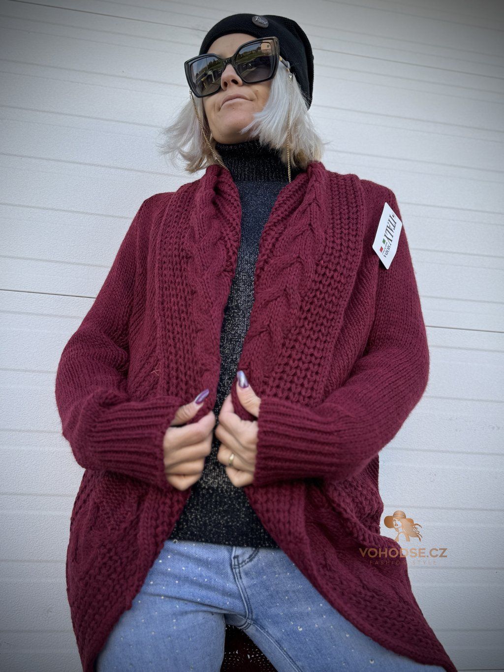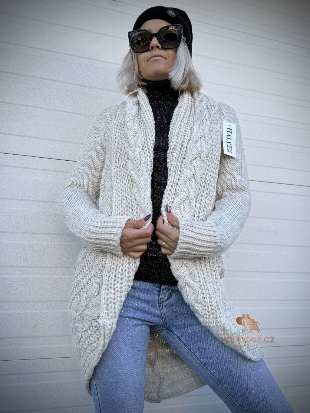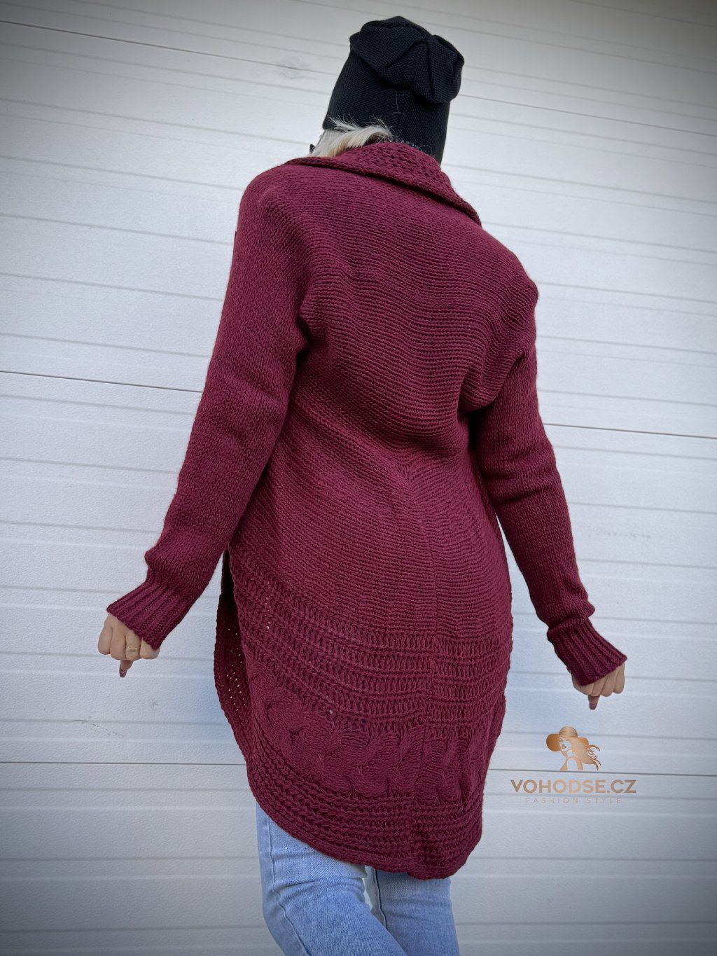 - Nadčasový dámský svetrový kardigan s copánkovým vzorem