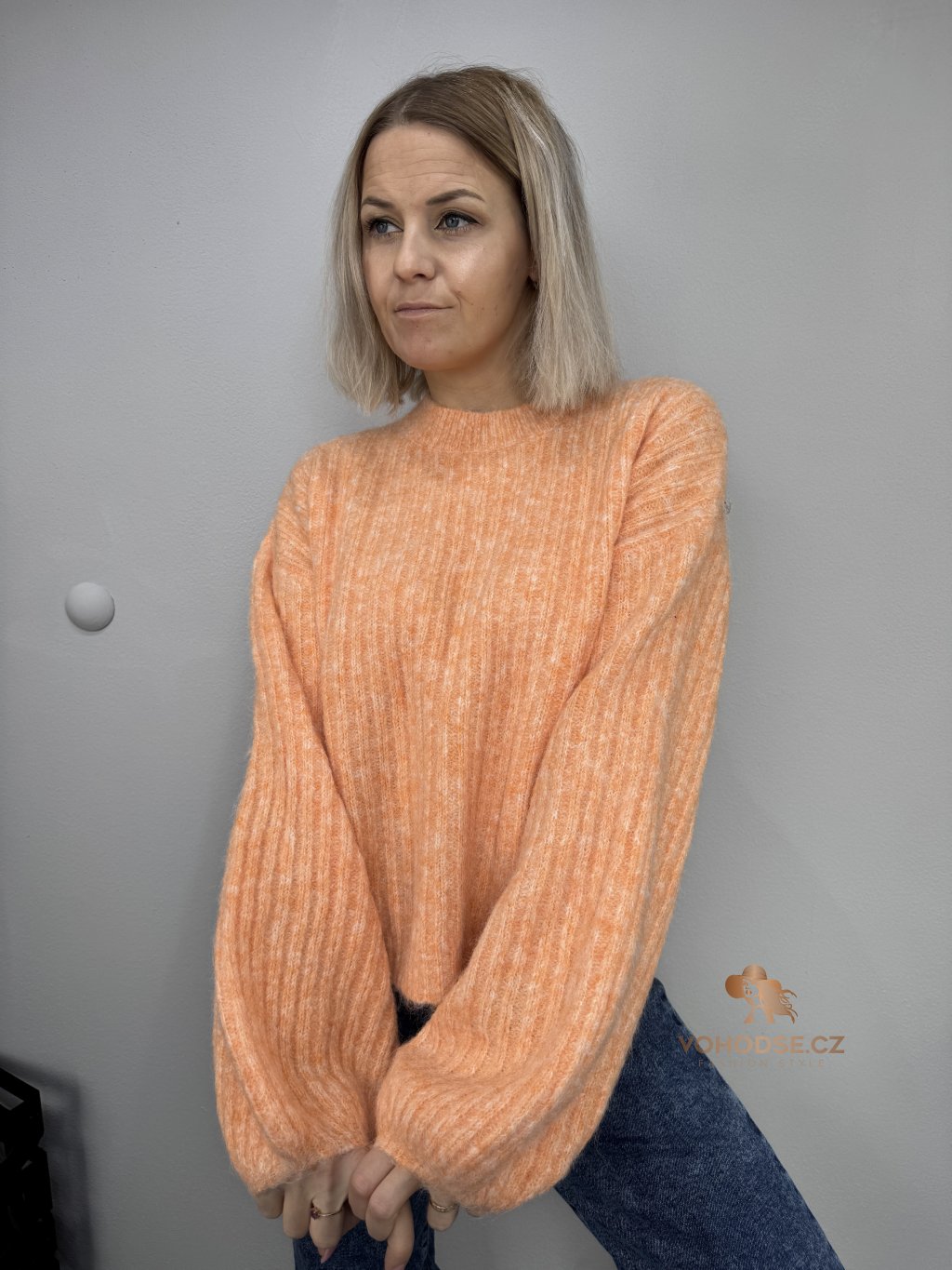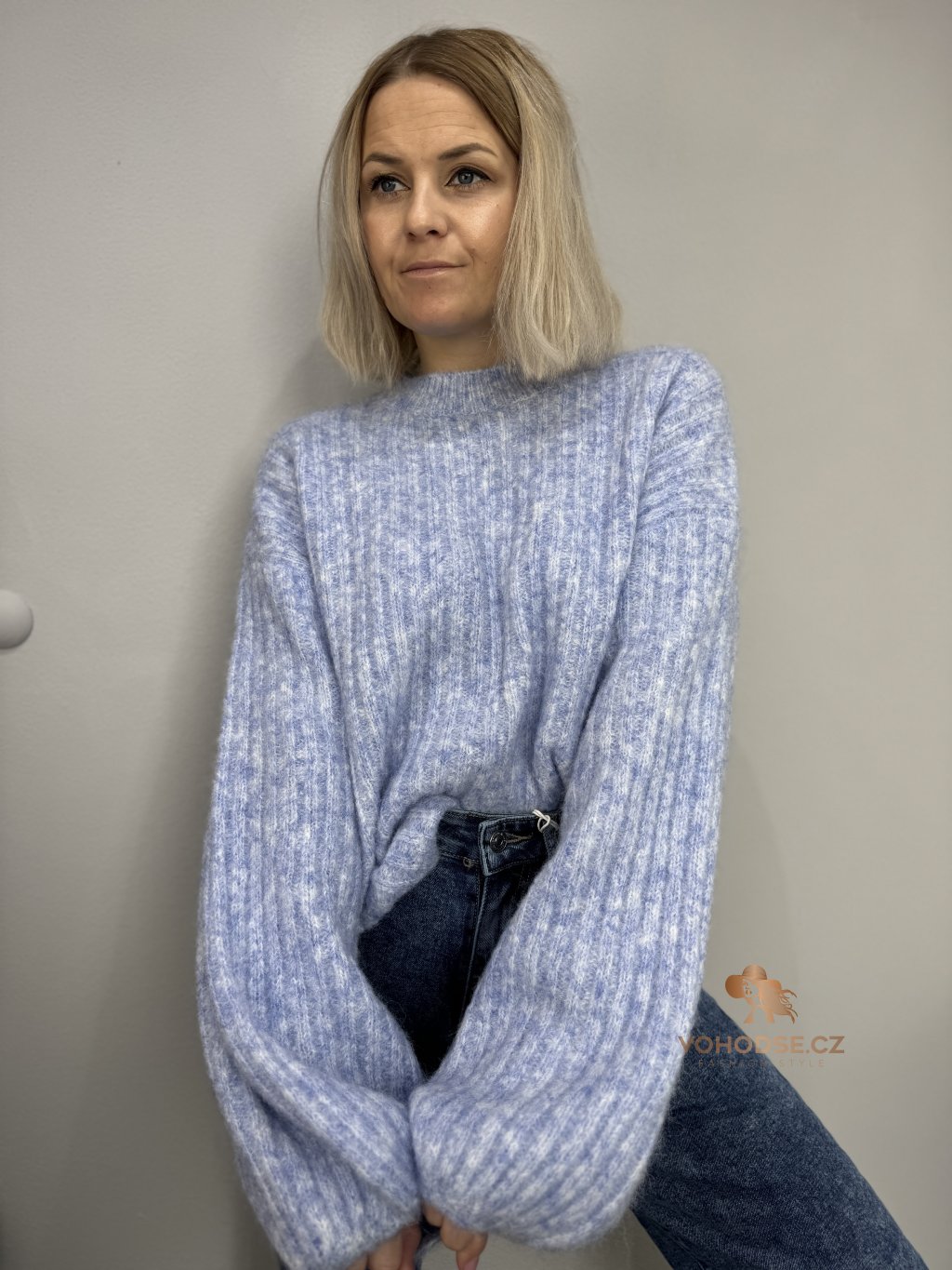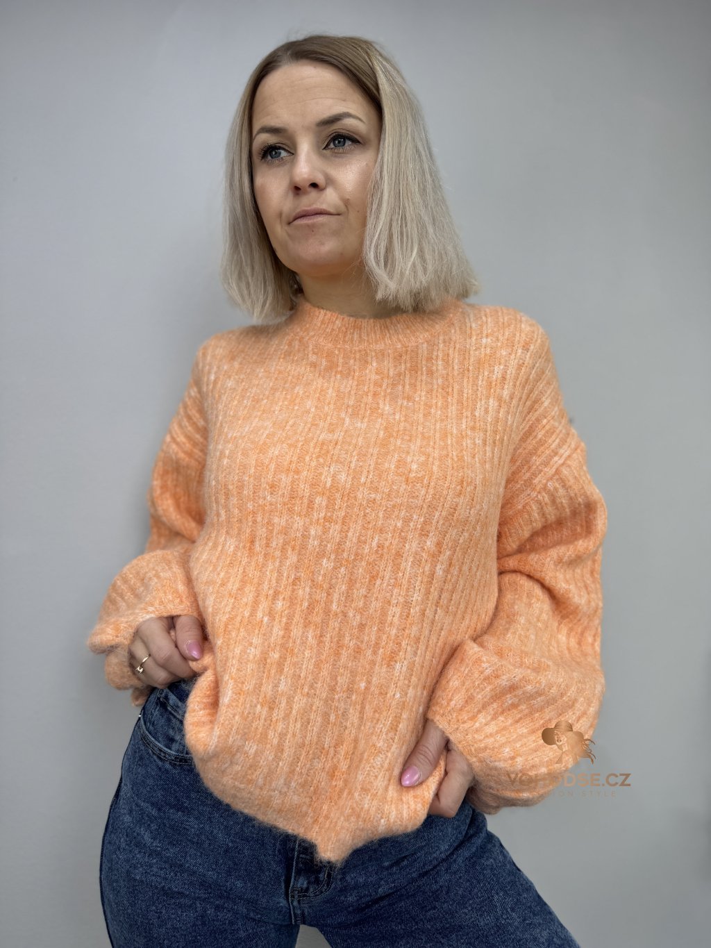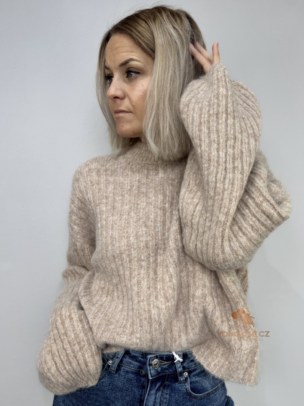 • Svetr má jemnou žebrovanou strukturu, volnější střih a delší - široké rukávy