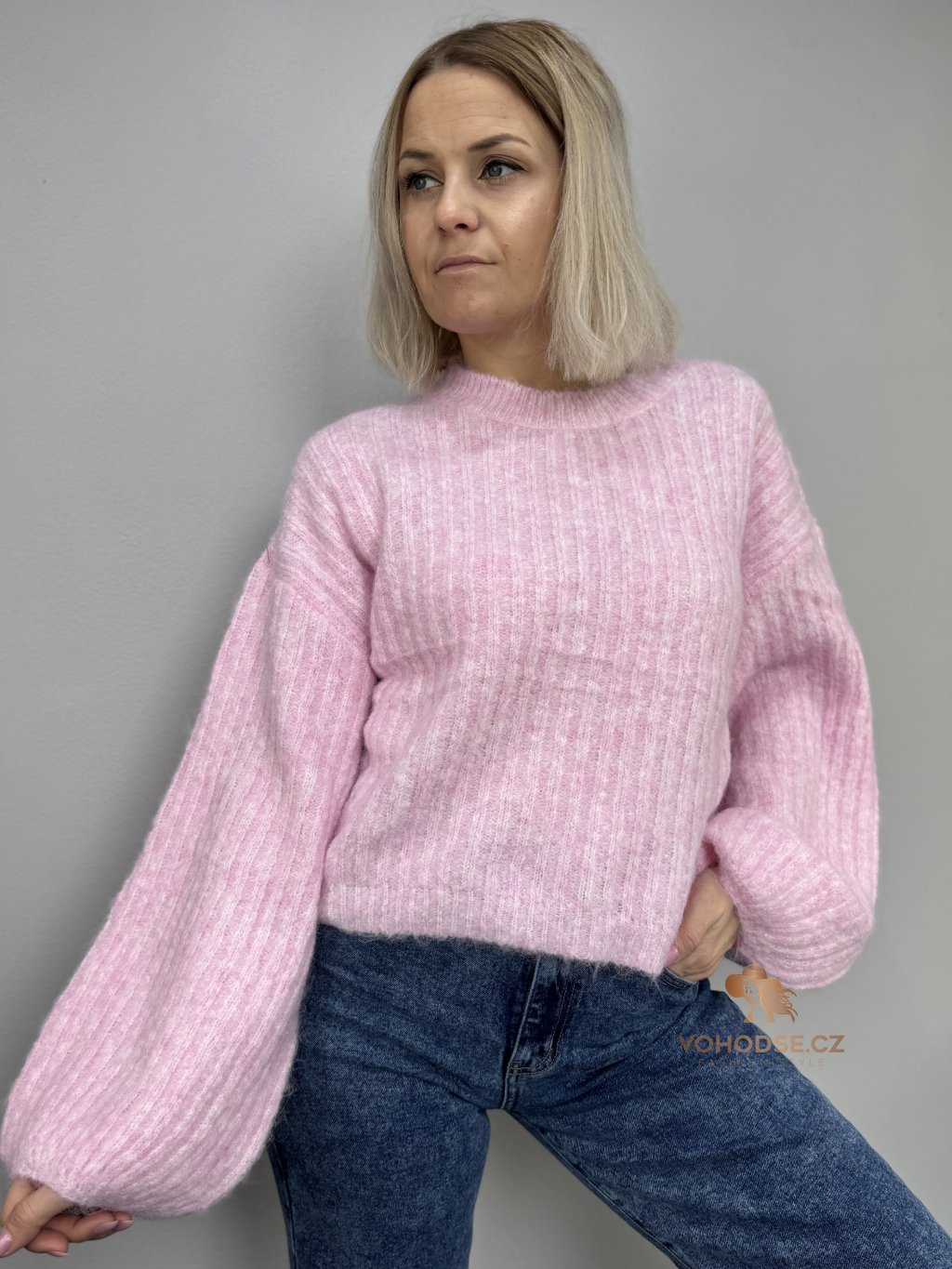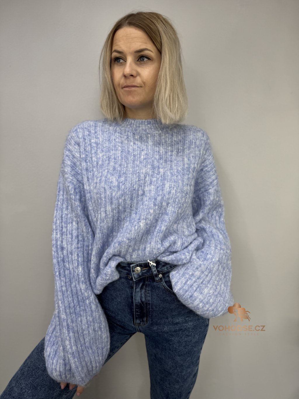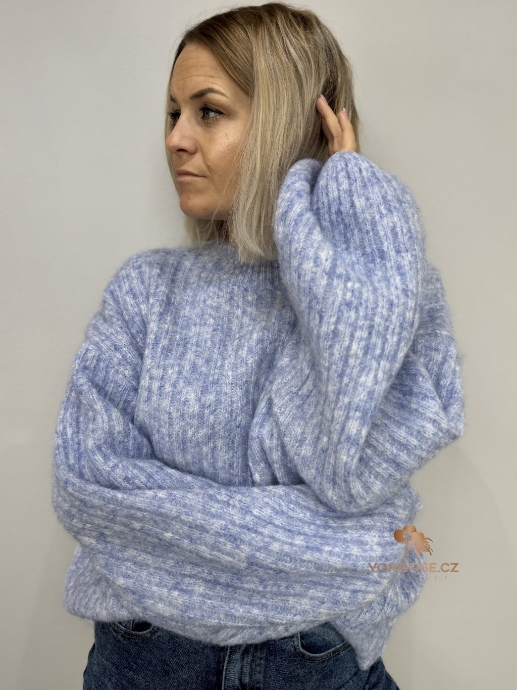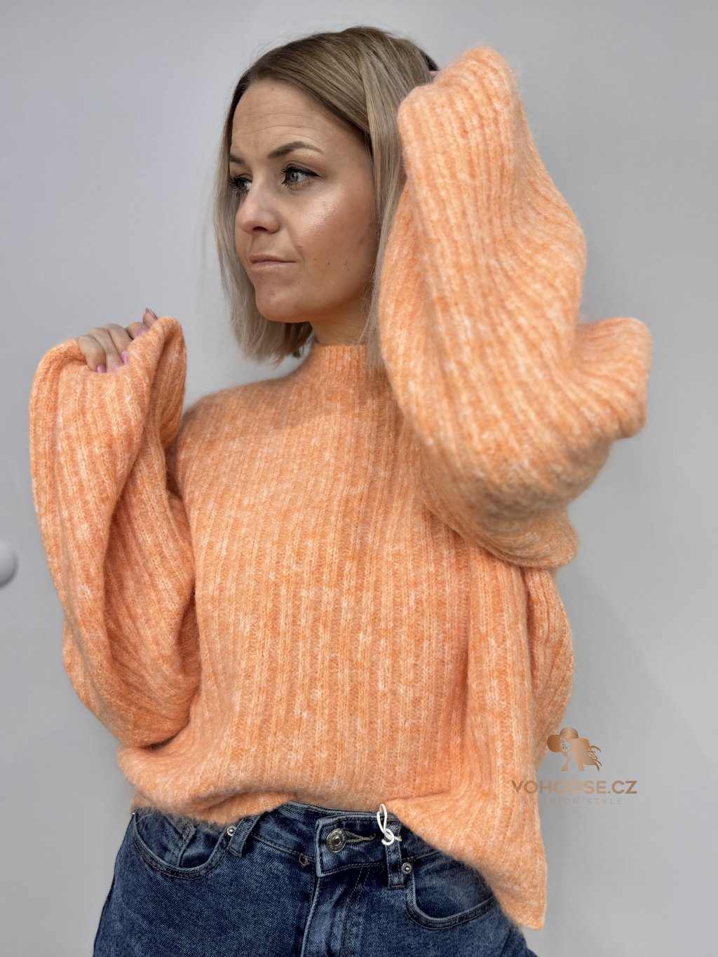 • Svetr má jemnou žebrovanou strukturu, volnější střih a delší - široké rukávy