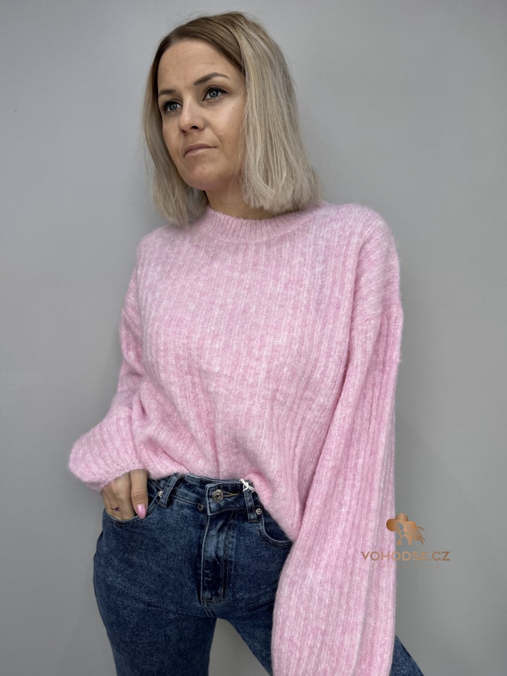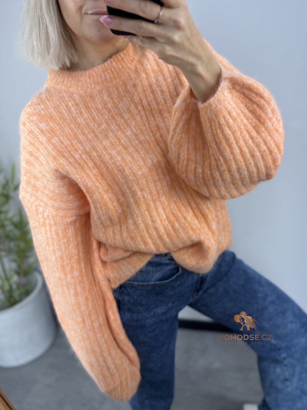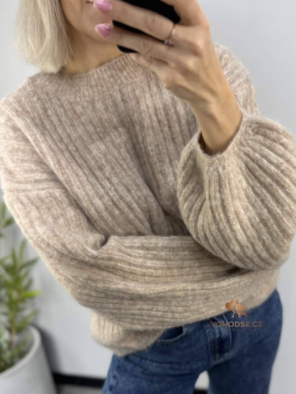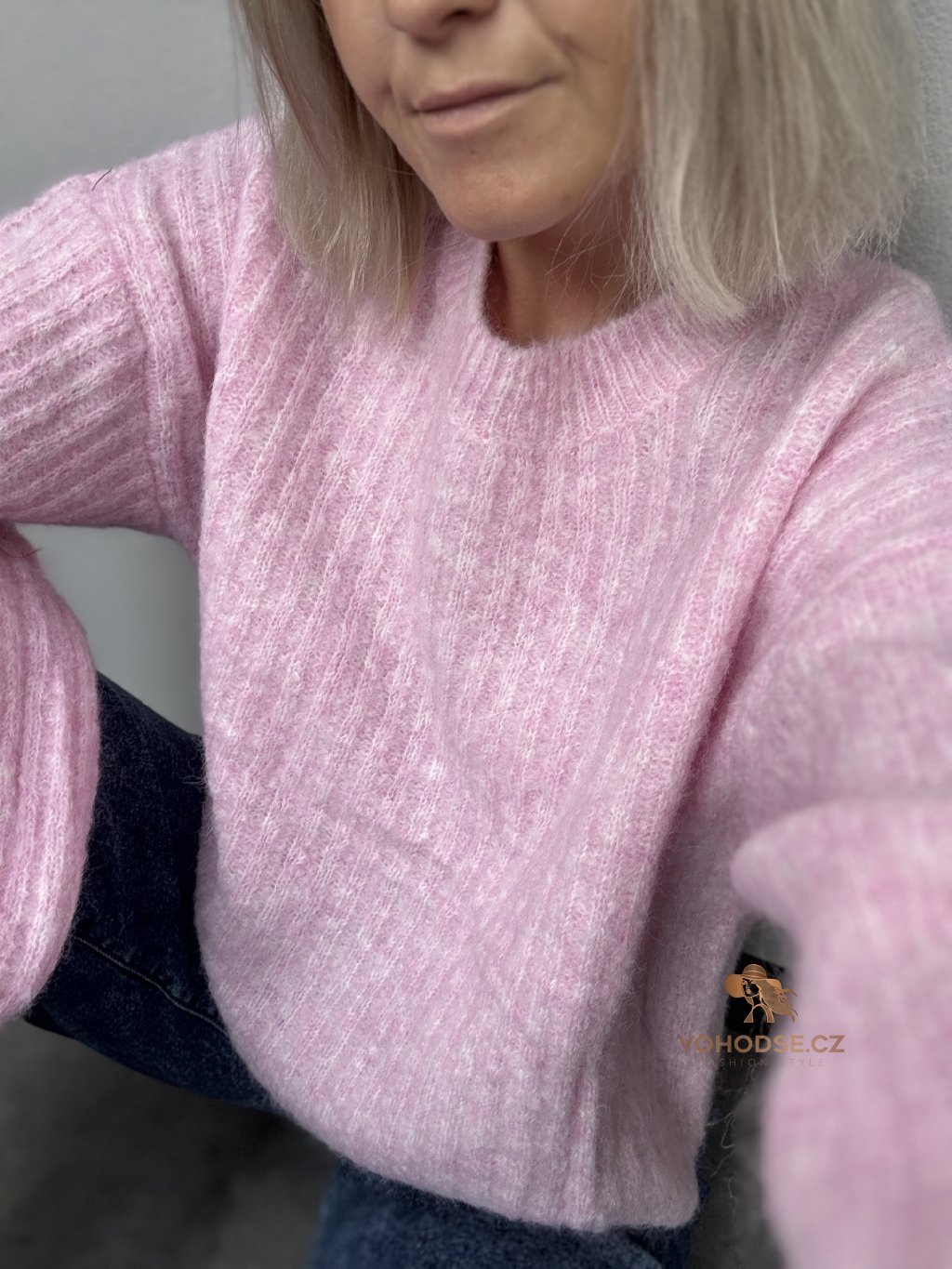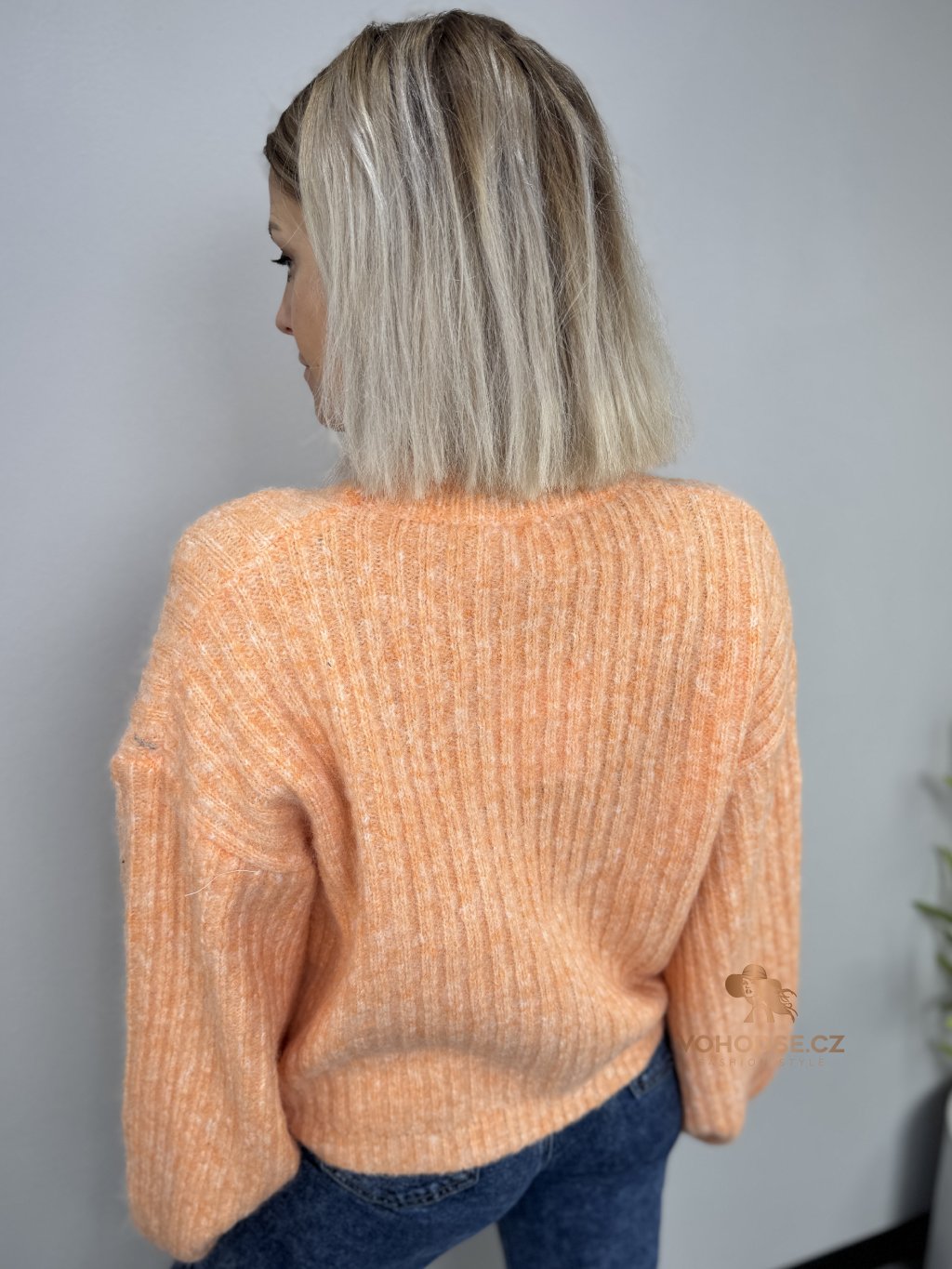 • Svetr má jemnou žebrovanou strukturu, volnější střih a delší - široké rukávy