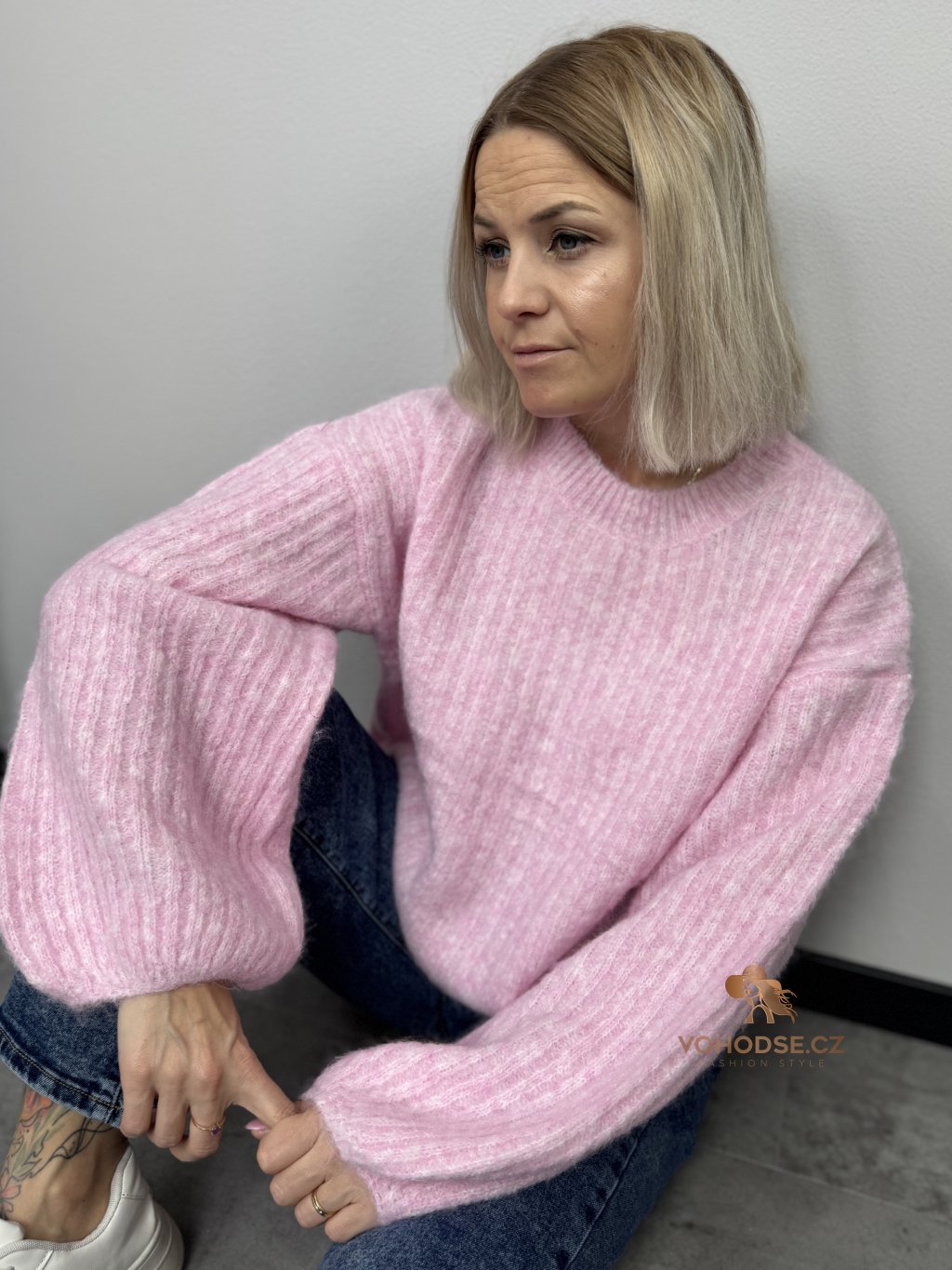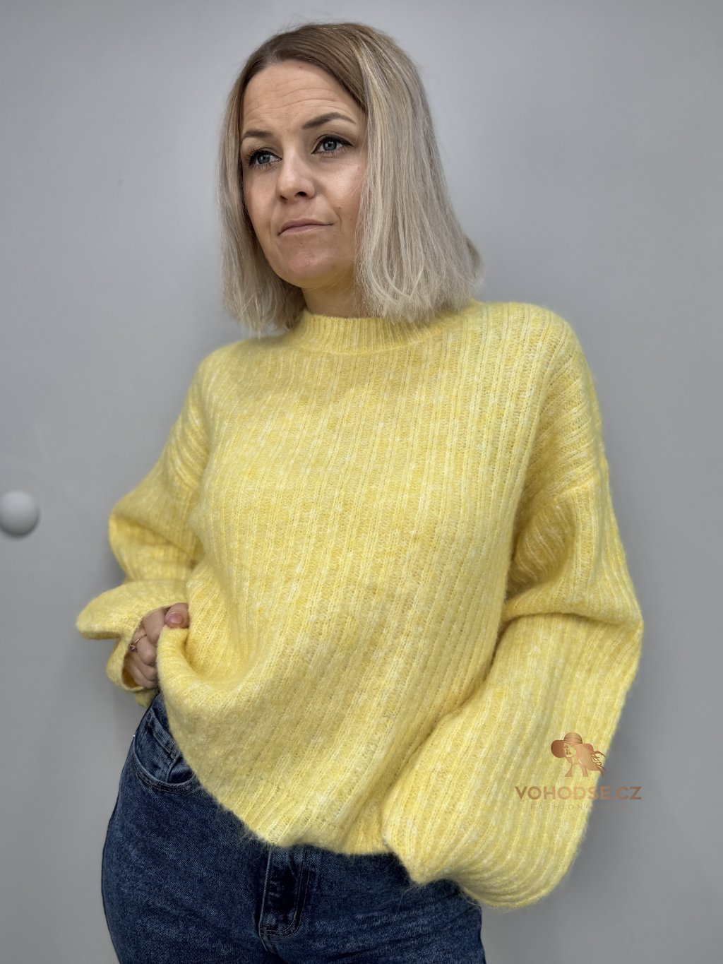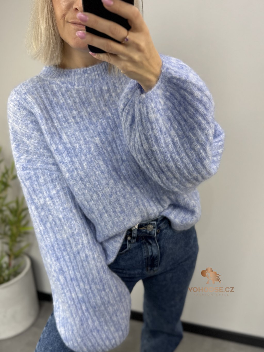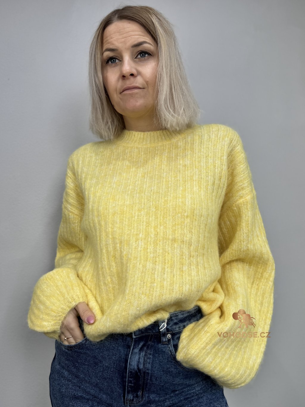 • Svetr má jemnou žebrovanou strukturu, volnější střih a delší - široké rukávy