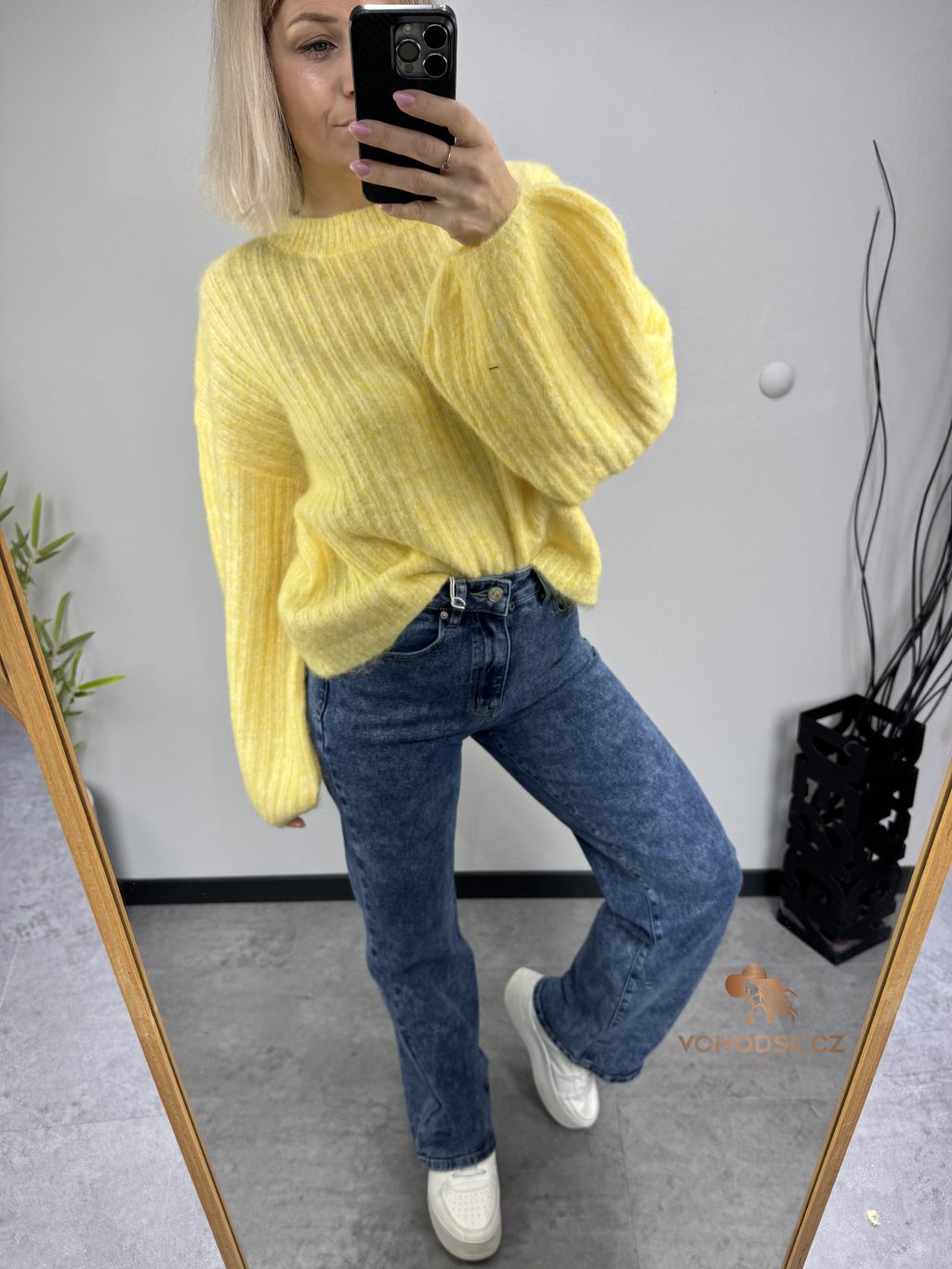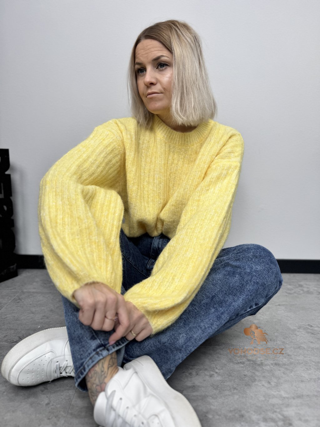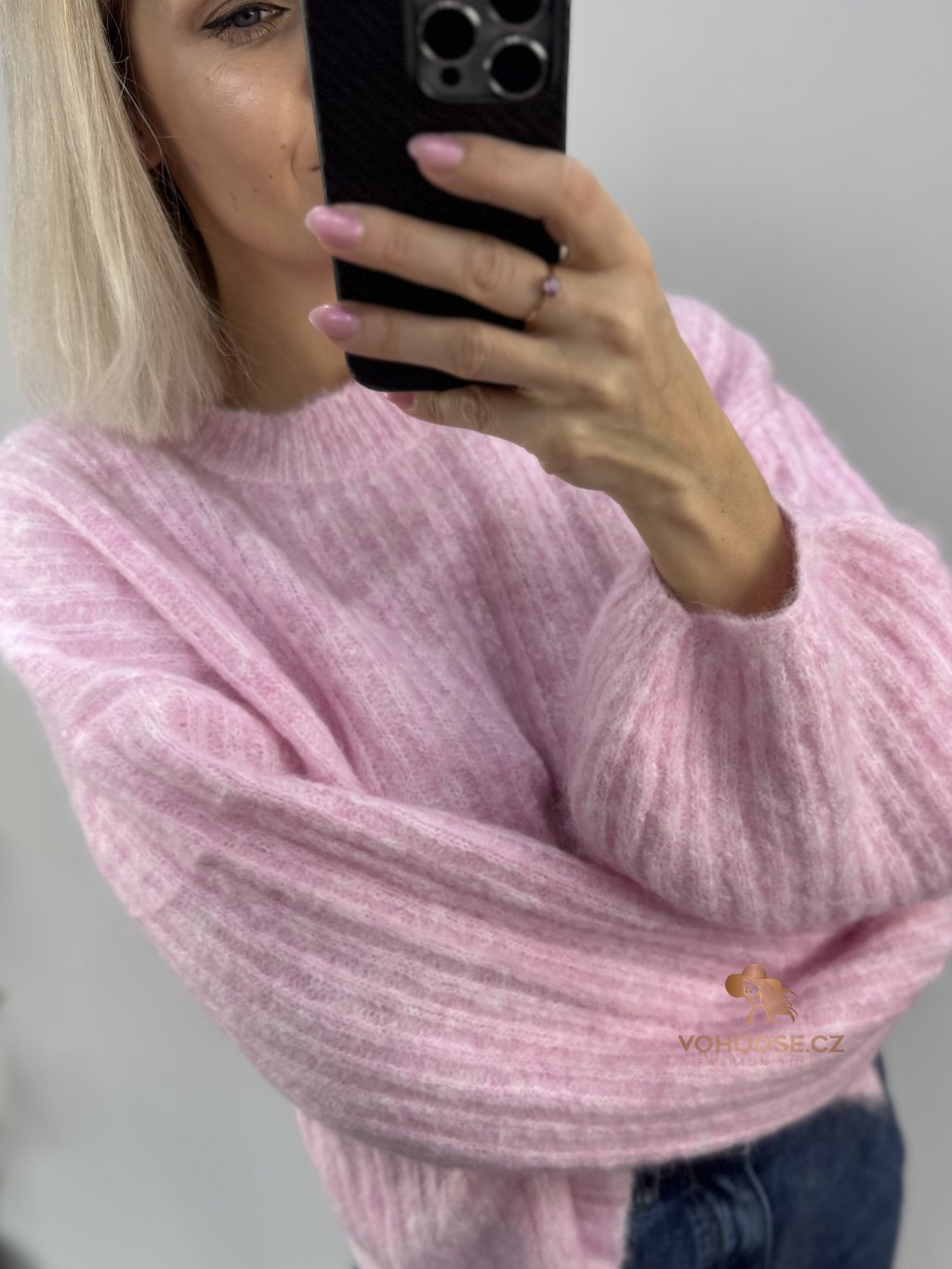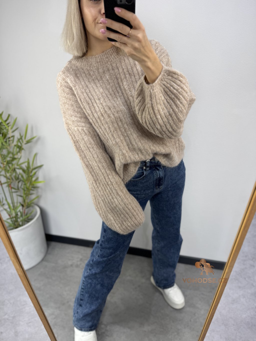 • Svetr má jemnou žebrovanou strukturu, volnější střih a delší - široké rukávy